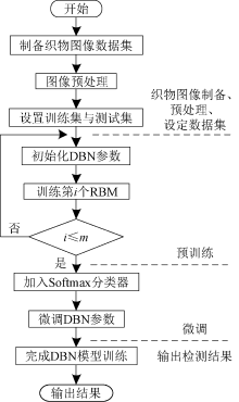 为提高织物疵点检测精度和效率,提出了一种基于深度信念网络的织物疵点检测方法。用改进的受限玻尔兹曼机模型对深度信念网络进行训练,完成模型识别参数的构建。利用同态滤波方法对图像进行预处理,使疵点图像更加清晰,同时抑制了背景图像。以Python语言,基于TensorFlow框架构建深度信念网络模型,对织物疵点图像进行处理得到学习样本,确定模型激活函数后,分析了各模型参数对织物疵点检测准确率的影响规律,得到激活函数为Relu, Dropout值为0.3,预训练学习率为0.1,微调学习率为0.000 1,批训练个数为64时,模型参数值达到最优。最后,利用在无缝内衣机上采集到的各类疵点图像,对深度信念网络织物疵点检测模型进行验证。结果表明:所提出的织物疵点检测方法能够快速、有效地对织物疵点进行检测和分类识别,准确率达到98%。