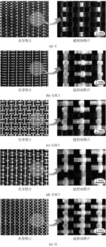 为增强碳纤维织物复合材料对电磁波的阻抗匹配性,减少二次反射,采用玻璃纤维调控碳纤维织物组织结构,并将其与水性聚氨酯复合,设计并制备了5种玻璃纤维/碳纤维(G/C)织物复合材料。借助超景深显微镜、矢量网络分析仪、模拟日光氙灯光源系统、红外热成像仪对G/C织物复合材料的形貌结构、电磁屏蔽性能、介电性能以及光热转化性能进行表征和分析。结果表明:在12.1 GHz下,纬纱采用2根玻璃纤维和单根碳纤维交替排列织造的G/C织物复合材料的屏蔽效能高达38.7 dB;G/C织物复合材料的组织结构变化可有效调控多种介电极化弛豫机制;G/C织物复合材料表面温度在模拟日光氙灯光源照射下响应速度快,其中玻璃纤维和碳纤维单根交替排列的G/C织物复合材料在2 kW/m2光照强度下照射300 s时,其表面温度可达71.8 ℃。