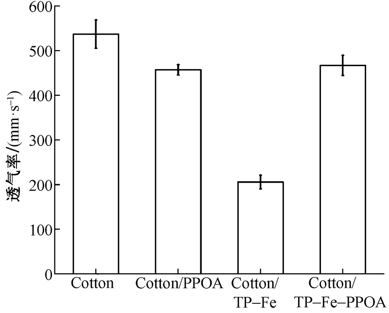 针对棉织物极易燃烧且不防紫外线,以及现有应用最广泛的卤系阻燃剂面临诸多限制等问题,采用茶多酚(TP)、 苯基膦酸(PPOA)和硫酸铁(Fe(SO4)3),制备了茶多酚铁苯基膦酸络合物(TP-Fe-PPOA),采用浸渍烘燥法制备了阻燃棉织物,研究了其阻燃、防紫外线、拉伸以及透气性。结果表明:TP-Fe-PPOA能均匀附着在棉织物上,且TP-Fe和PPOA之间有一定的协同作用;TP-Fe-PPOA整理棉织物可实现离火自熄,其损毁长度仅为 6.7 cm, 极限氧指数从17.6%提升至24.7%;TP-Fe-PPOA整理棉织物的最大热释放速率较纯棉织物降低了11.8%,意味着火灾放热强度降低,燃烧反馈给织物的热量越少,减缓了火焰的传播;其防紫外线性能也大幅度提升,紫外线防护系数从纯棉织物的7.47±0.19提升至37.85±2.34,接近防晒产品的要求,在实现阻燃和防紫外线功能的同时,保留了较好的透气性。