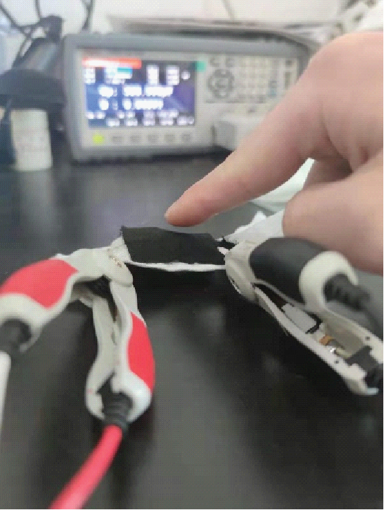 Conclusion 1) The influence of fabric structure on electrical properties can be concluded as: the greater the fabric density, the denser the yarn arrangement, the more conductive paths, and the smaller the resistance; the fabric electrode not only affects the effective relative area, but also affect the dielectric constant, which in turn affects the overall capacitance. The effect pattern needs further study. 2) The optimized assembly conditions of the capacitive sensor are the wool fiber and air aggregates with a height of 1.4 cm as the dielectric layer, and the electrode is the polypyrrole composite fabric of crepe satin (69 g/m2). The existence of air in the dielectric layer has a great influence on the height of the dielectric layer and the change of the dielectric constant during the compression process; the structure of the electrode fabric will affect the dielectric constant and effective relative area during the compression process. The above factors will ultimately affect the sensitivity of the sensor. Therefore, the next step will be to further optimize the structure of the dielectric layer and fiber composition to find a quantitative relationship, thereby improving the sensitivity of the sensor. 3) Application studies have shown that the capacitive sensor has the ability to sense the bending changes of fingers and the proximity of metal objects and fingers within 10cm, which is expected to apply this multifunctional, low-cost electronic fabric sensor to artificial skin, wearable health detection and contactless detection equipment superior.