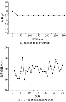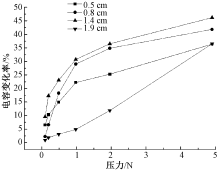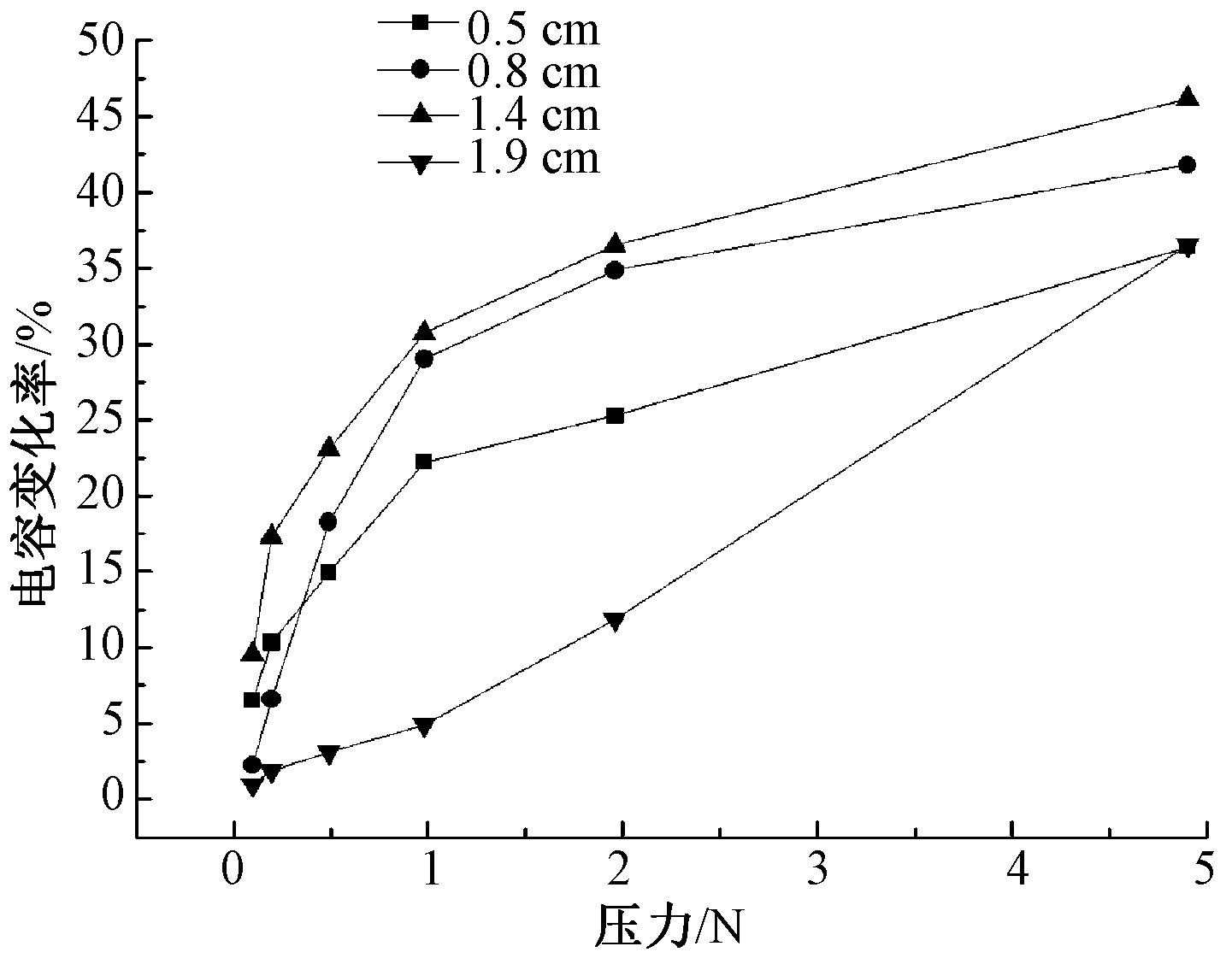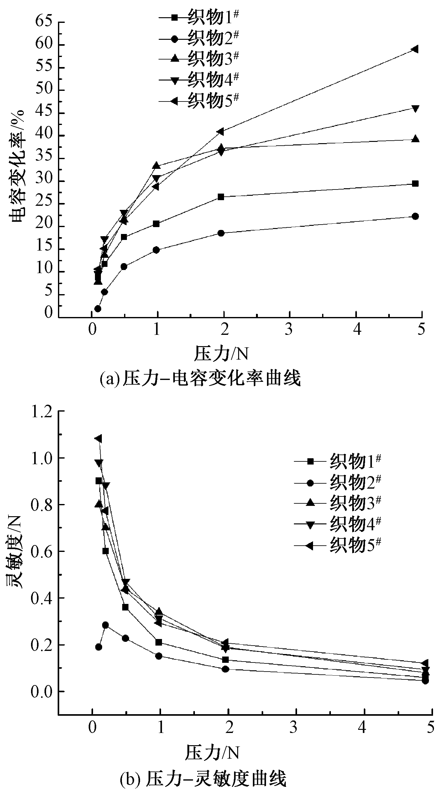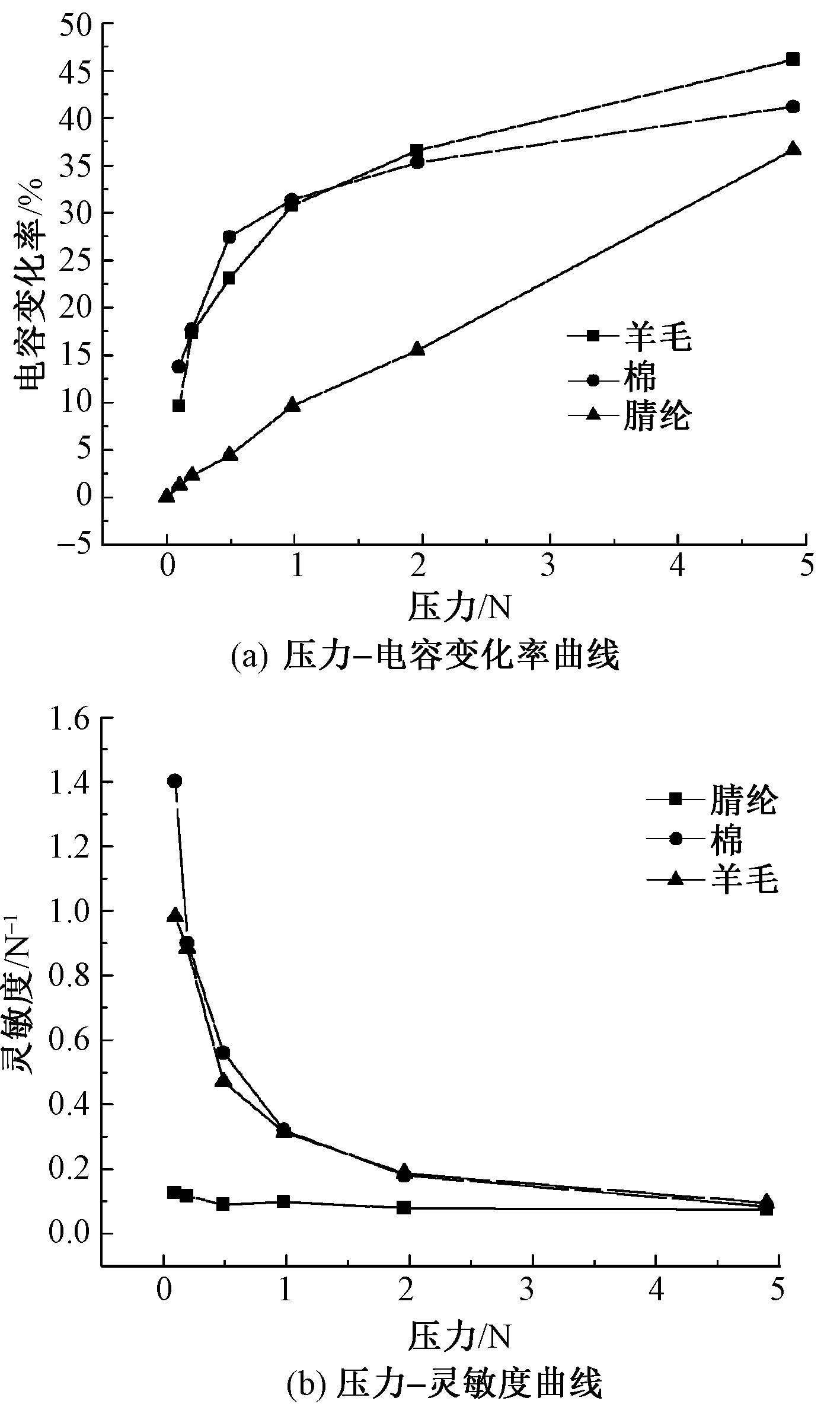 Results The square resistance of polypyrrole composited crepe satin fabric (69 g/m2) was the smallest, which was 42 Ω/□. This is because the density of crepe satin silk is the largest, the diameters of yarns are also larger, the warp yarn is twisted, and the weft yarn is not twisted. The sensitivities of cotton and wool fiber capacitors were better than that of acrylic fiber. Because wool fiber has better elasticity and uses less, so wool fiber is finally selected as the dielectric layer. When the height of the dielectric layer is higher, the wool content is larger, the dielectric constant is larger, and the capacitance value is larger, but when the height is too high, the air content decreases, and the deformation ability of the overall dielectric layer decreases, thereby reducing the capacitance change rate, so he height of 1.4 cm as the dielectric layer had the best performance. The fabric 5# (69 g/m2 plain crepe satin) has the highest capacitance of 66 pF when it is used as the electrode. This is probably because the porosity of the fabric 5# is the smallest, the effective area of the electrodes is the largest, and the capacitance is the highest. With the increase of applied pressure, the capacitance increases and the capacitance change rate also increases. The highest sensitivity was 1.08 N-1 at 0.098 N. In the process of applying pressure, the structure of the fabric electrode will change, which will cause the change of the effective relative area and the air content in the fabric electrode, which will also affect the dielectric constant. When the pressure is greater than 1.96 N, the capacitance changes rate of the fabric 5# is the largest, and its sensitivity is the best, so the fabric 5# is used as the capacitance sensor electrode. The capacitive sensor has good stability, and is expected to be used in limb movement monitoring and safety monitoring in public places.