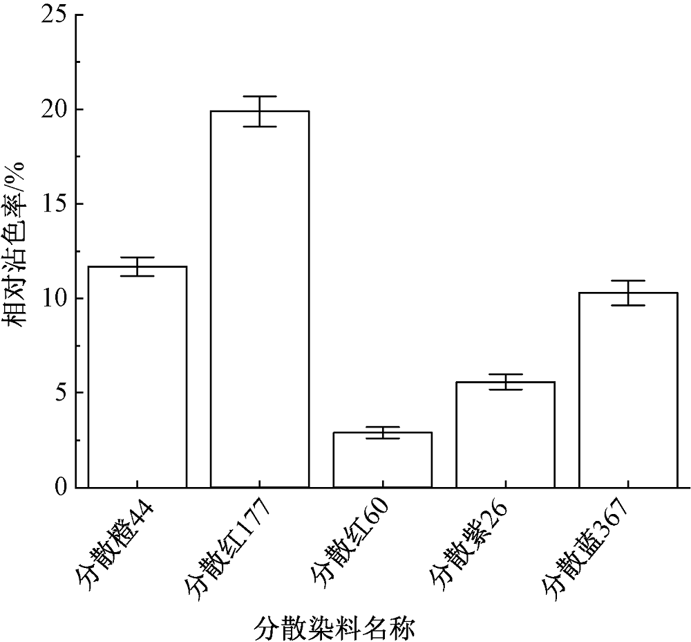 为实现涤纶/棉混纺织物的少水无盐、污水零排放染色关键技术,基于前期开发适用于非水介质中对涤纶的上染率较高的偶氮染料以及传统水浴常用的蒽醌和杂环染料,探究了非水介质染色体系中,分散染料结构、染色温度、促染剂、保温时间、分散剂对分散染料沾染棉纤维的影响及作用机制,并使用相对沾色率对分散染料在涤、棉上的分配进行表征。结果表明,在非水介质染色体系中,实验所用的蒽醌类分散染料对涤纶组分的上染率仅有12%,并不适用于该体系中对涤纶/棉混纺织物染色;而选用的偶氮类和杂环类分散染料对涤纶组分上染率在80%以上;非水介质染色体系中,加入极性小分子促进剂,不仅能够改善涤纶组分的溶胀,且借助分子的强极性降低分散染料在非水介质中的溶解度,提高分散染料对涤纶组分的上染率,从而降低分散染料对棉组分的沾色;染色过程中加入分散剂NNO,不仅不能提升分散染料的染色性能,反而影响其沾色率。根据分散染料对涤纶的上染率及相对沾色率,得出分散染料的最佳染色条件为:温度140 ℃、促染剂含量10% (o.w.f)、保温时间60 min。