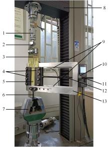 抽拔实验装置 1—抽拔力传感器;2—缠绕式夹具;3—待抽拔纱线; 4—夹板;5—织物试样;6—对中块;7—下夹头; 8—试验机横梁;9—光滑槽口;10—压电式传感器; 11—螺栓;12—螺杆;13—铝架。"