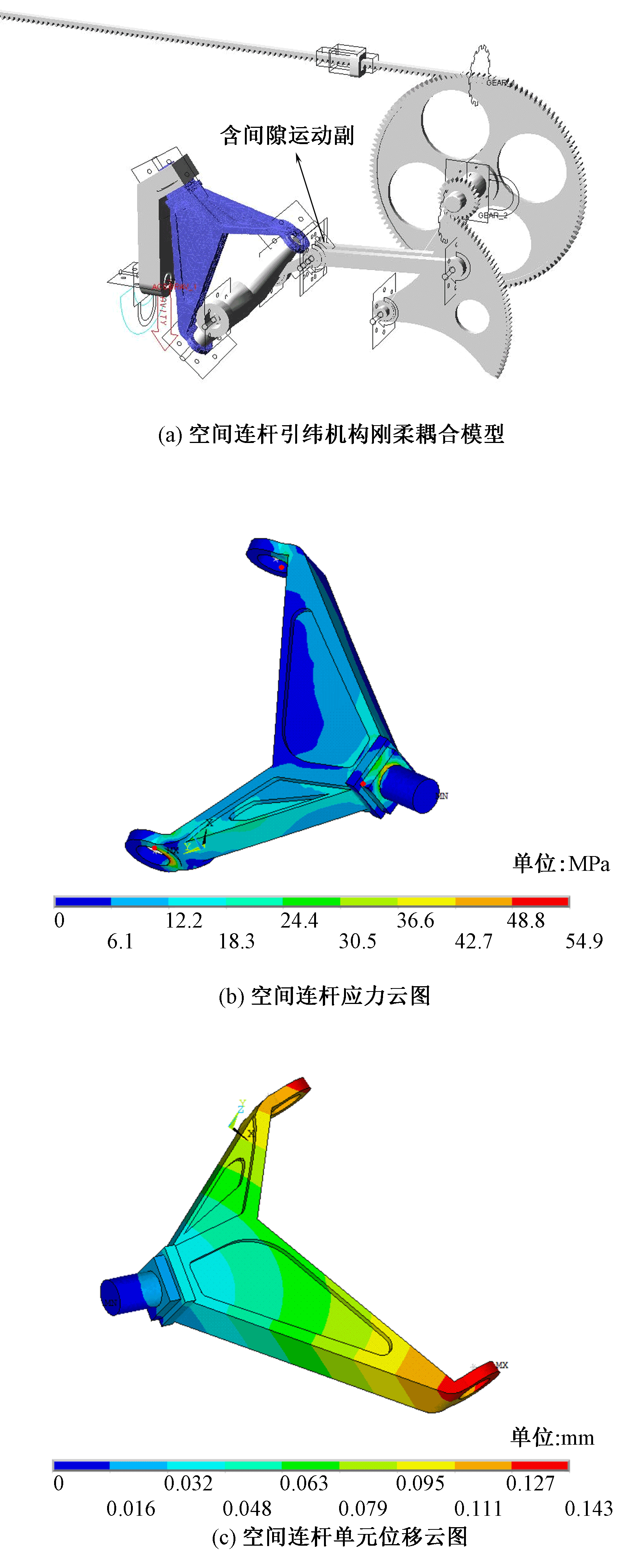 为准确预测空间连杆引纬机构间隙磨损机制,通过结合Lankarani-Nikravesh与Bai碰撞力模型,建立可变刚度与阻尼系数非连续接触碰撞力模型,采用改进的Coulomb摩擦力模型描述含间隙机构旋转铰的切向摩擦力,通过Lagrange方法对系统动力学建模;其次选取空间连杆为柔性化对象,综合Ansys与Adams分析,对空间连杆引纬机构进行刚柔耦合动力学仿真;最后将系统的动态仿真响应结果与Archard模型相结合,求解运动副磨损情况。结果表明:柔性构件可以有效缓解机构间隙碰撞的冲击作用,间隙为0.15 mm条件下,剑头加速度振荡最大幅值缩减53.2%;当间隙升至0.5 mm后,虽磨损范围大幅增加,但间隙磨损深度并未随之大幅提升。