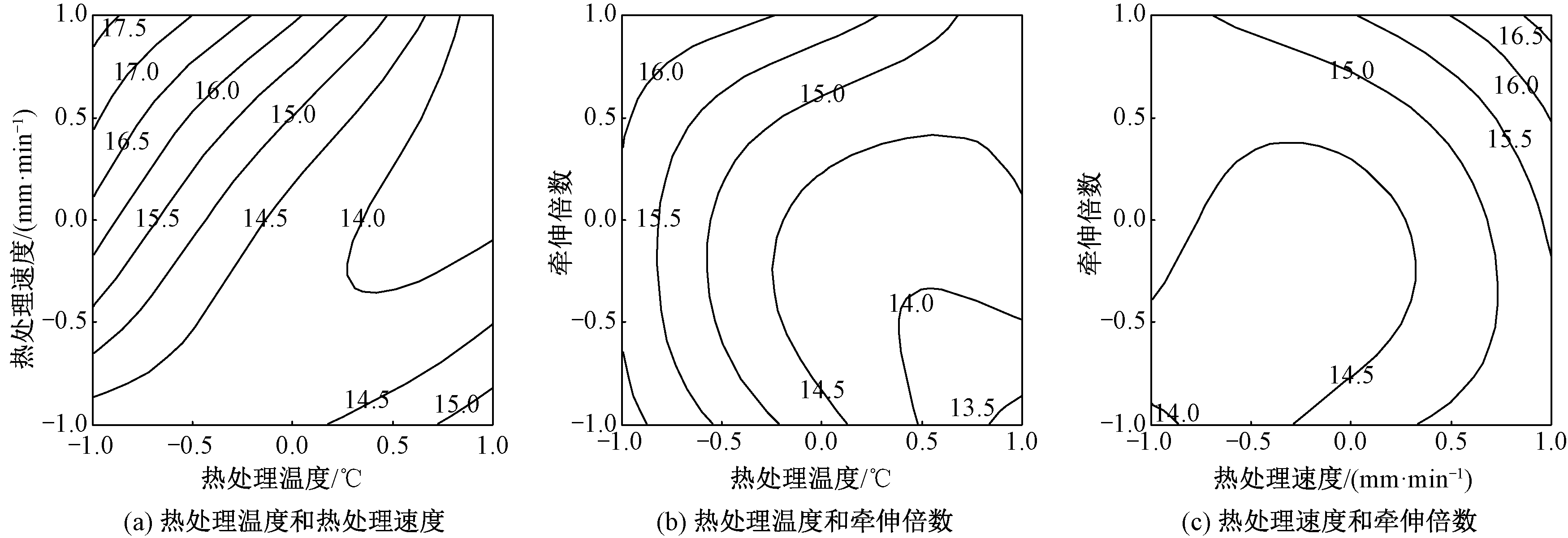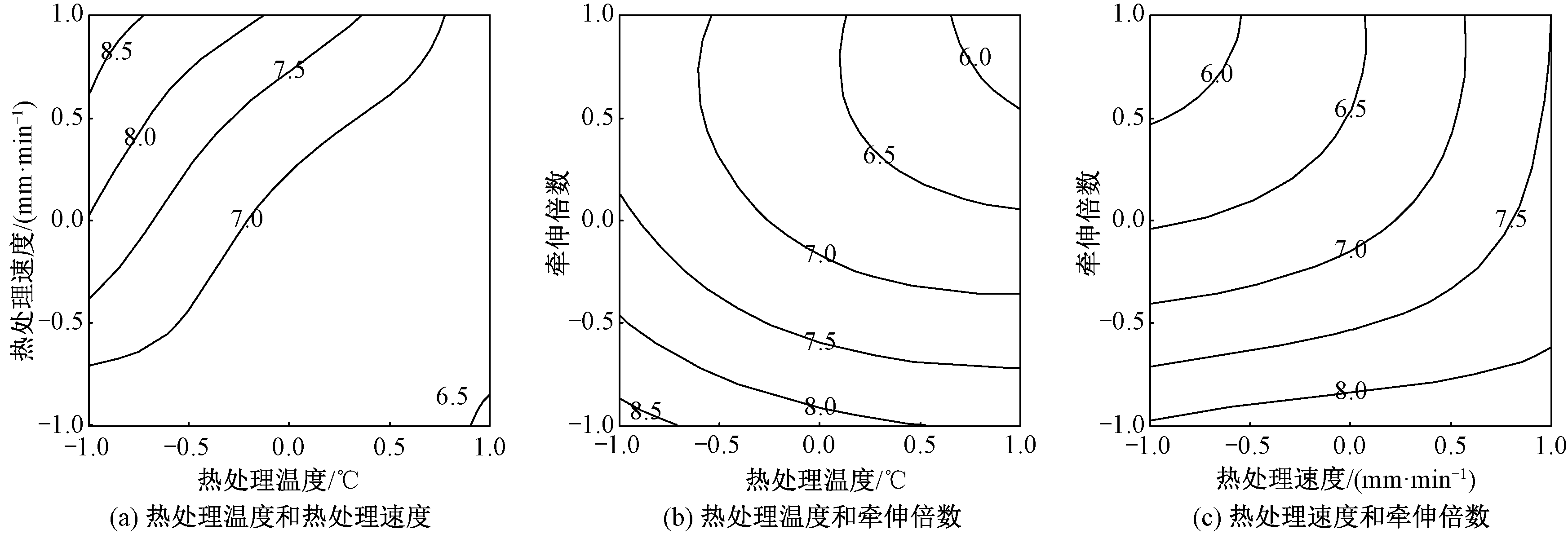 包芯纱断裂强度响应值与热处理工艺关系的等值线图"