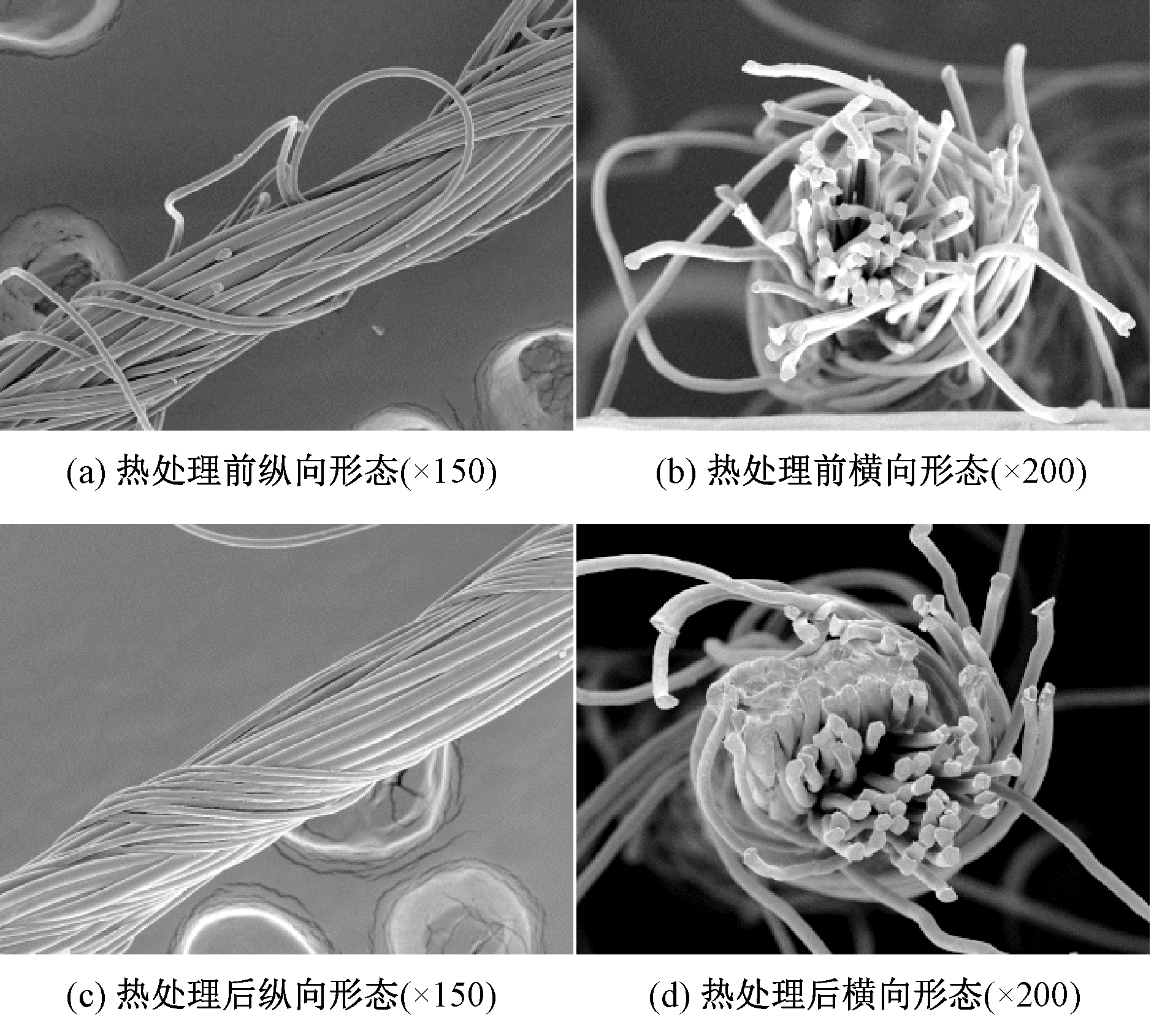 喷气涡流纺包芯纱热处理前后纵向和横向形态照片"
