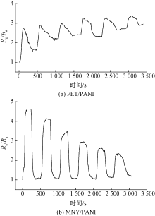 为开发高质量的气敏传感器,利用水浴静电纺丝法制备以涤纶(PET)为芯纱,聚酰胺6(PA6)纳米纤维为包覆层的微纳纤维复合纱(MNY),基于原位聚合方法对MNY进行连续导电处理,制备微纳米纤维复合纱/聚苯胺(MNY/PANI)复合导电纱,以此作为气敏元件,同时将相同参数下制备的PET/PANI复合导电纱也作为气敏元件进行对照,探究不同结构纱线之间气敏效果的差异。研究结果表明:MNY具备良好的皮芯结构,经导电处理后MNY表面均匀分布了聚苯胺颗粒,MNY/PANI的电导率最高可达7.53 S/cm;相比于PET/PANI气敏元件,MNY/PANI气敏元件因其纳米结构的高比表面积对NH3的灵敏度更高,能表现出更好的响应-恢复效果,重复性和稳定性更好,已初步具备了作为优良气敏元件的条件。