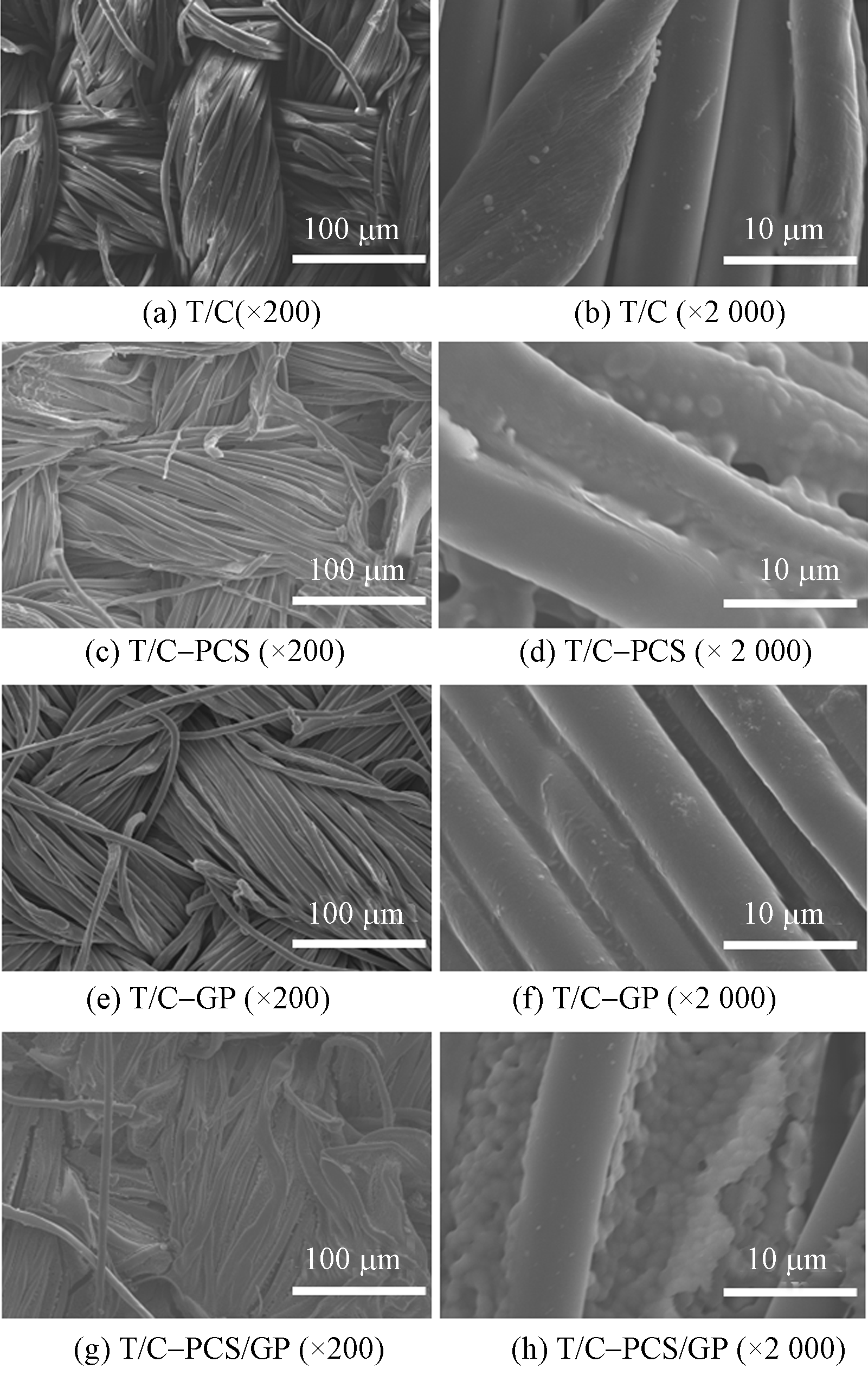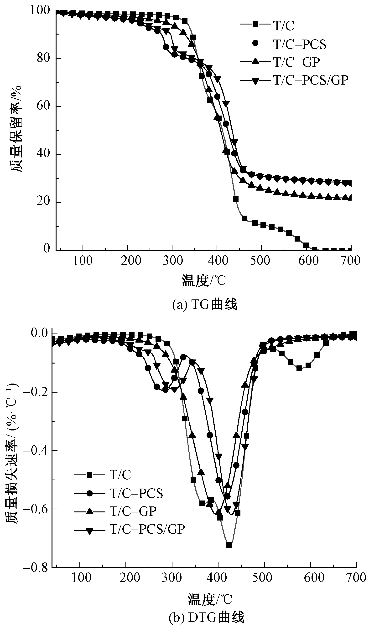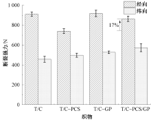 为得到阻燃且满足实际应用需求的涤纶/棉混纺织物(T/C),选用亚磷酸化壳聚糖(PCS)和γ-哌嗪基丙基甲基二甲氧基硅烷(GP-108)制备阻燃整理剂(PCS/GP),通过一步浸渍法对涤纶/棉混纺织物进行整理,并研究其微观表面形貌、热稳定性能、阻燃性能、拉伸性能以及白度等。结果表明:PCS/GP成功在涤纶/棉混纺织物表面沉积成膜,包裹住涤纶/棉纤维;T/C-PCS/GP呈现典型的涤纶/棉混纺织物二步热降解过程,在700 ℃时保留有28.5%的残炭量,说明PCS/GP提高了阻燃涤纶/棉混纺织物在高温区的热稳定性能;T/C-PCS/GP的LOI值提升至26.5%,实现了垂直燃烧测试中的离火自熄,残炭扫描电镜照片表明,PCS/GP的沉积改善了涤纶/棉混纺织物燃烧时存在的“支架”效应;T/C-PCS/GP的热释放速率峰值和火灾蔓延指数较T/C分别降低了20%和40%,表明其火灾危险性大幅度降低;锥形量热测试后的残炭电镜照片表明,T/C-PCS/GP能够保留完整的织物编织结构,残炭表面存在明显的膨胀炭层,与垂直燃烧测试结果相符;热重红外测试结果表明,T/C-PCS/GP分解提前,主要影响棉组分热降解并促进其成炭,而高温区的红外谱图表明,在致密炭层的保护下,T/C-PCS/GP的热降解得到抑制。T/C-PCS/GP与T/C-PCS相比,断裂强力提升17%,其断裂强力与T/C的断裂强力相差不大;同时,GP-108的使用改善了T/C-PCS的黄变问题,提升了T/C-PCS/GP的白度。然而,阻燃样品耐久性较差,需要后续改进。