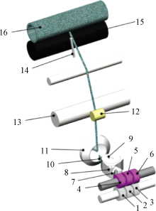 三通道数控转杯纺纱结构 注:1、2、3—左、中、右给棉罗拉;4、5、6—给棉皮辊;7—集棉器;8—中罗拉;9—分梳辊;10—梳棉气流通道;11—转杯;12—引纱皮辊;13—引纱罗拉;14—横动装置;15—卷绕罗拉;16—纱管。"