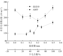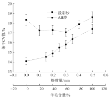 针对前罗拉钳口处须条断开后回缩产生的不匀,提出段彩纱纺制时2组须条交替提前喂入原理。采用棉/羊毛双皮圈2组须条间断或连续喂入的方法制得棉/羊毛段彩纱及AB纱,并对成纱结构及性能进行分析。结果表明:棉/羊毛段彩纱有棉和羊毛的纯色纱段,也有棉和羊毛混色纱段;喂入提前量增加了混色段长度,但制得段彩纱的混色段长度仍在同轴后罗拉段彩纱的17%以内;随着喂入提前量的增加,棉/羊毛段彩纱条干均匀度、断裂强度和有害毛羽先改善后恶化;喂入提前量为0.3 mm时,棉/羊毛段彩纱的断裂强度是未提前喂入的1.38倍,达到棉/羊毛(30/70)AB纱断裂强度的96%;合适的喂入提前量可制得混色段短且强度高的棉/羊毛段彩纱,在花式纱线领域具有潜在的应用价值。