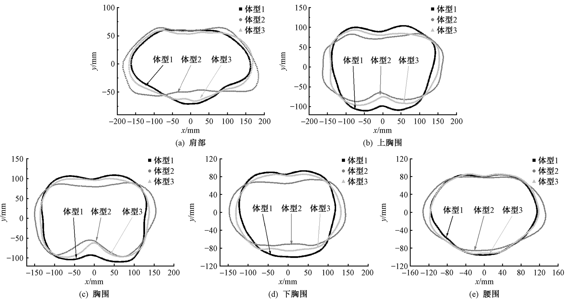 为表征同一号型下的人体体型形态差异,选取与原型样板密切关联的肩部、胸部及腰部水平特征截面进行研究。通过[TC]2获取145名18~25岁青年女性的三维点云数据,选取占比最高的160/84 A体型样本,采用K-means聚类进行体型细分,提取肩部、上胸围、胸围、下胸围、腰围5层水平特征截面,运用极径表征形态差异。研究结果表明:同一国标号型身高胸围数据虽然相似,但存在形态差异;160/84 A体型可分为圆厚体、宽扁体、中等体,分别占比7.69%、53.85%及38.64%。3类体型中宽扁体肩宽>中等体肩宽>圆厚体肩宽,肩点处最大极差为3.82 cm。圆厚体的上胸围厚、胸围厚和下胸围厚最厚,其次是中等体胸围厚,宽扁体的胸围厚最薄,在前中处最大极差分别为3.22、3.62和2.97 cm。宽扁体较圆厚体、中等体肩点位置向前中方向偏移10°,宽扁体、中等体胸点位置较圆厚体向侧缝方向偏移10°~20°。