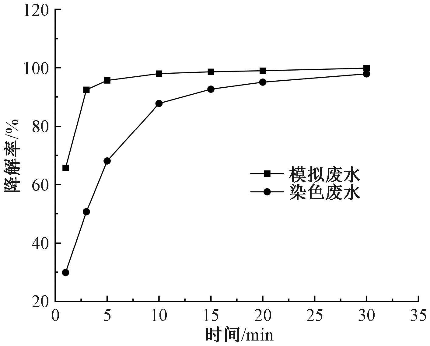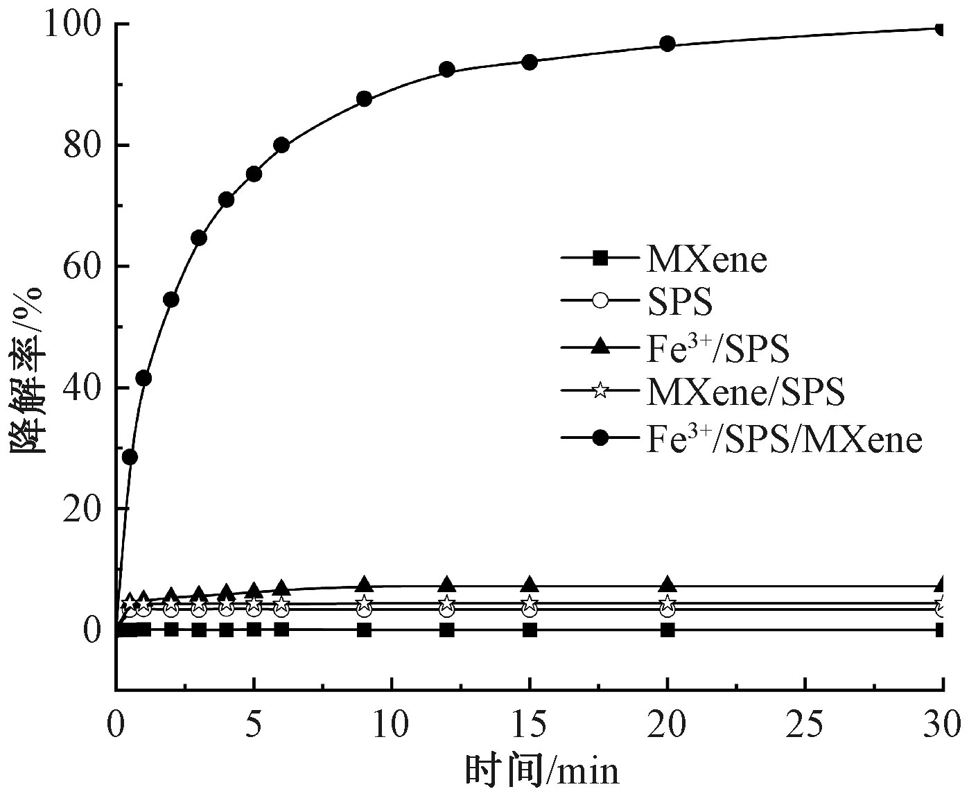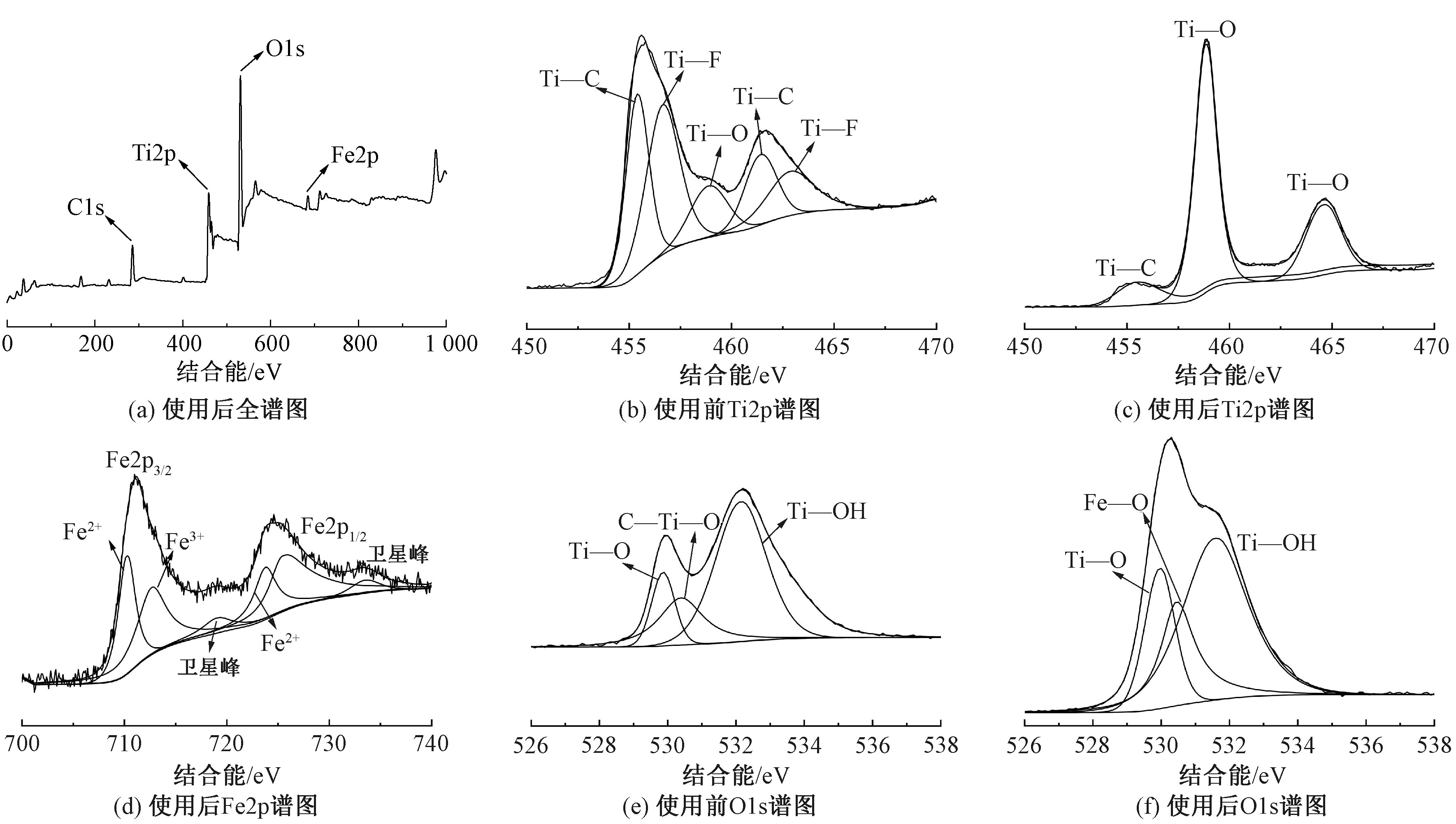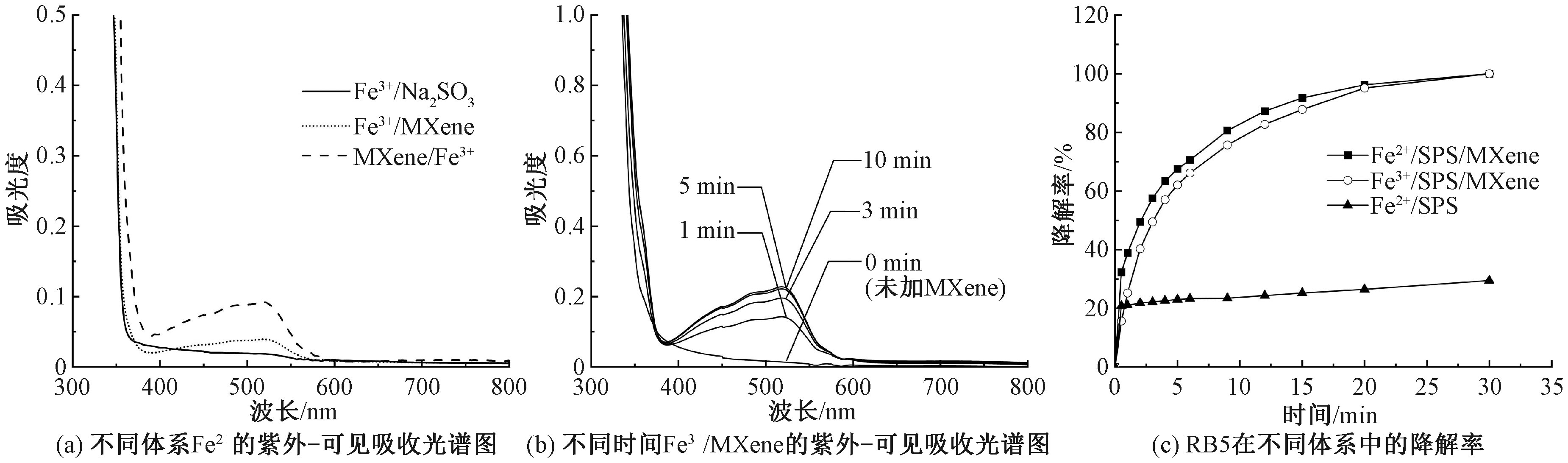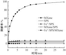 摘要: 为提高染色废水处理效率,降低废水处理过程中的过渡金属用量,利用二维纳米材料MXene(Ti3C2)还原微量Fe3+,实现过硫酸钠(SPS)快速活化降解C.I.活性黑5(RB5)废水。以0.05 g/L RB5溶液为研究对象,降解率为评价指标,探究SPS质量浓度、FeCl3浓度、MXene质量浓度、初始pH值和RB5降解率的关系。通过自由基猝灭实验,探究染料降解过程中自由基的贡献率。结果表明:RB5模拟染液使用2 g/L SPS、0.06 mmol/L FeCl3和60 mg/L MXene混合液在25 ℃处理30 min时,降解率高达99.3%;RB5降解符合准一级反应动力学,中性条件下,利用Fe3+/SPS/MXene体系处理模拟染液时,RB5的降解速率为0.15 min-1,较不含MXene体系处理的0.000 8 min-1提高187倍;使用MXene后,MXene表面附着颗粒结构,生成大量Ti—O,使Ti元素含量降低,同时引入Fe元素,使其结晶度降低1.13%;利用MXene可触发Fe3+/Fe2+循环,加速活化SPS降解染料,·OH是降解染料的主体;使用Fe3+/SPS/MXene处理染色废水时,NaCl等无机盐会显著改变脱色速率,但几乎不影响最终脱色率。