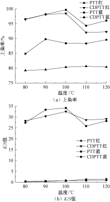CDPTT与PTT纤维在不同温度下的上染率及K/S值"