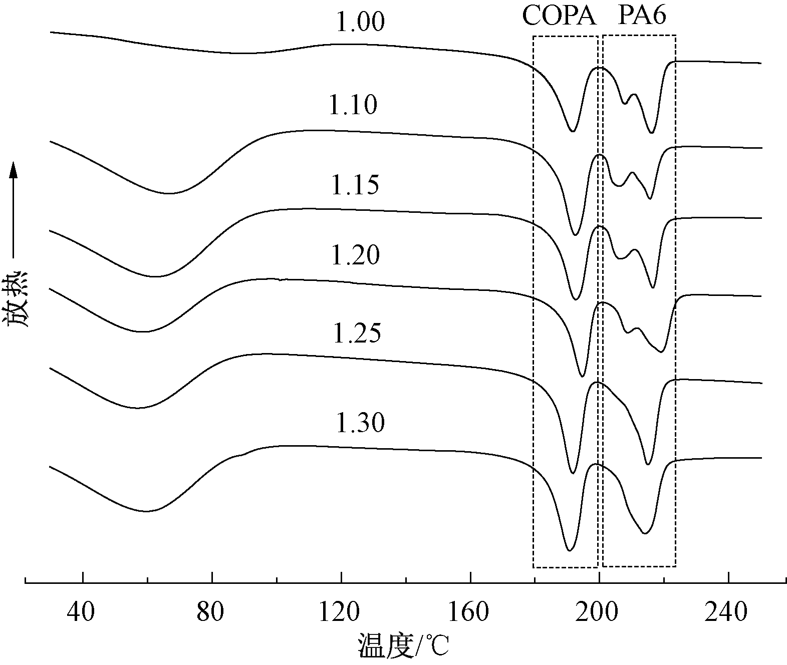 不同牵伸倍数PA6/COPA偏心皮芯复合纤维的DSC曲线"