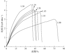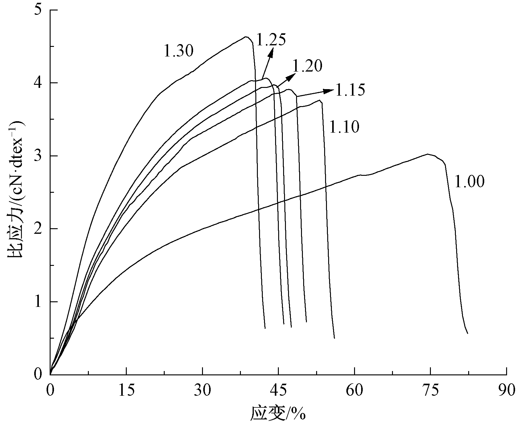 不同牵伸倍数PA6/COPA偏心皮芯复合纤维的应力-应变曲线"