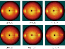 不同牵伸倍数PA6/COPA偏心皮芯复合纤维的二维X射线衍射图"