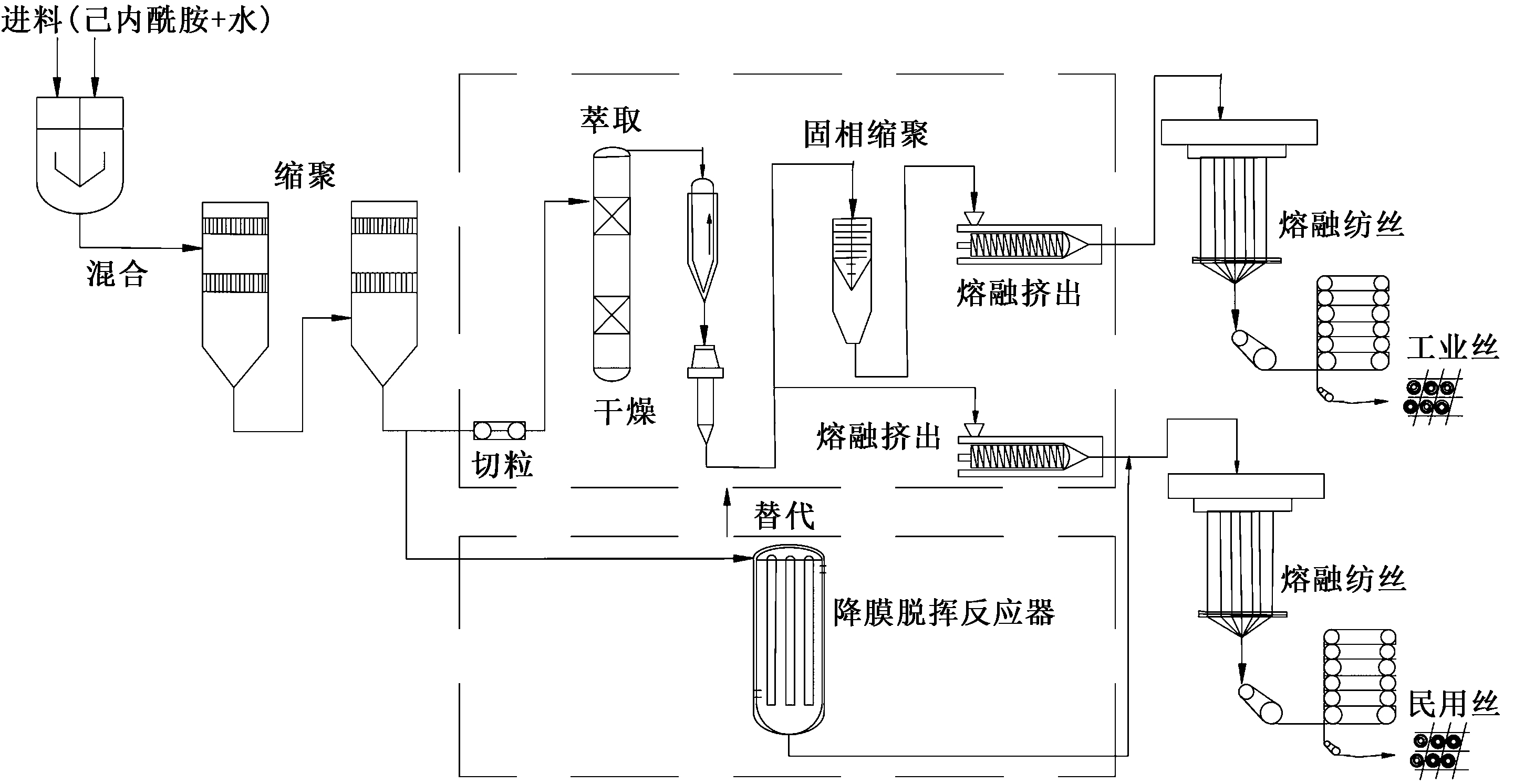 Objective In view of the current situation of long chip spinning production process and high energy consumption in the production of polyamide 6(PA6), a process simulation analysis was conducted on the preparation of low-volatile polyamide 6 melt. By adding a falling film devolatilization reactor with vacuum facility after two-stage polymerization, multiple systems such as cooling granulation, hot water extraction, drying, solid phase adhesion and extrusion melting could be eliminated to realize the direct spinning of polyamide 6 fiber.