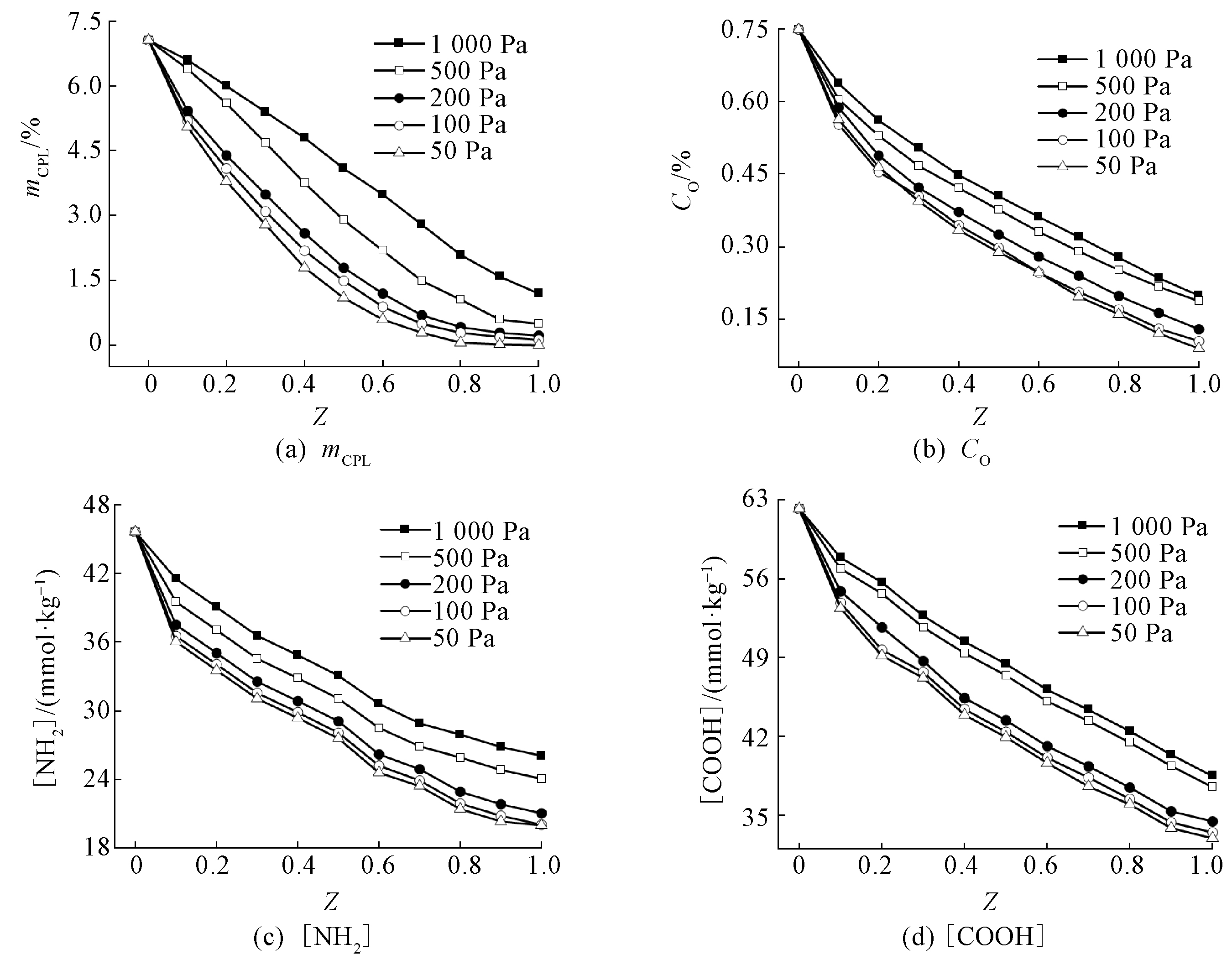 Conclusion When the ηr of inlet material increases, the ηr of melt decreases with the increase of falling film flow distance, and the mCPL and CO decrease gradually. After the melt with a ηr of 2.35 passes through the falling film devolatilization reactor, its ηr can be increased to 3.1. The effects of reaction temperature, pressure and other conditions on polymer number, Mn, ηr, mCPL, CO and end group concentration in falling film devolatilization reactor were studied. With the increase of reaction temperature, the Mn of polymers in a certain range increased linearly, the mCPL decreased from 7.062% to 0.230%, the CO decreased from 0.710% to 0.115%, and the end group concentration([NH2] and [COOH]) also decreased gradually. By controlling the pressure of the falling film devolatilization reactor, it is shown that the relative viscosity of the polymer is improved at low pressure. Reduce the mCPL and CO in melt. By adjusting and controlling the inlet melt parameters of the falling film devolatilization reactor, high quality PA6 melt can be obtained under suitable devolatilization reaction temperature and vacuum degree. The research results are conducive to the development of direct spinning technology of PA6 melt.