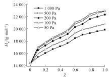 不同压力下数均分子量沿反应器轴向方向的变化"