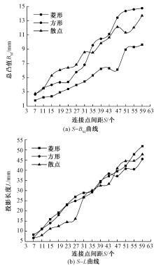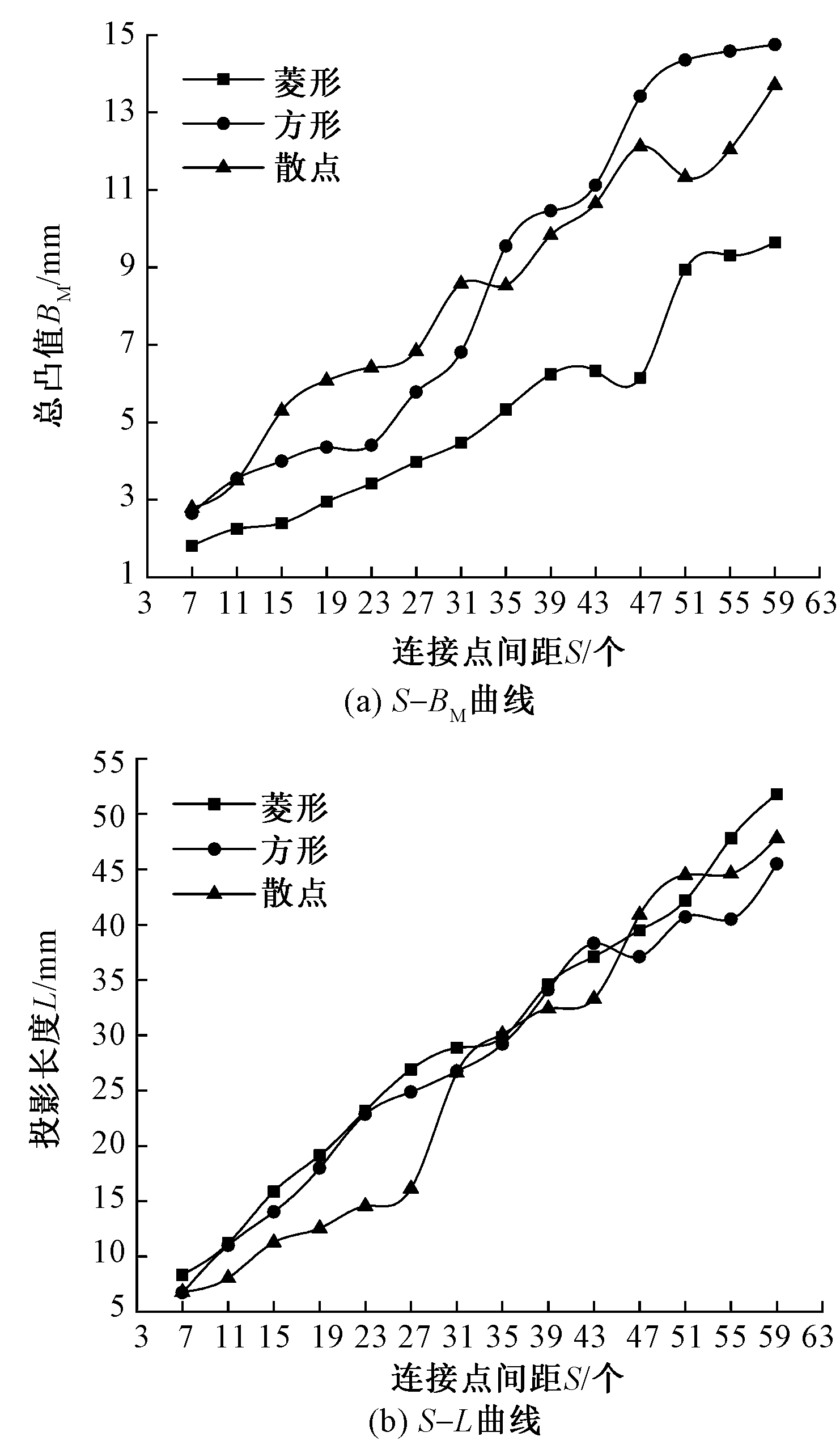 不同连接点图形与间距对凹凸结构的影响曲线"