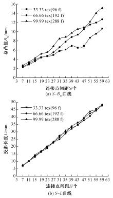 Results The progressive increase in convex values of different connection point shapes as the spacing between connection points gradually increases. Among these shapes, the overall growth trend of the diamond shape was relatively slow, because under the same spacing between connection points, the expandable space size of the weft-lining yarn exhibited the characteristics of scatter > square > diamond. The projection length of the surface was primarily determined by the spacing between the connection points. The projection length of different connection point shapes showed a relatively consistent growth trend with the increase in spacing and exhibied a linear relationship. The data results for different weft-lining fineness were plotted. The results indicated that under the same spacing between connection points, the thicker the lining yarn was the higher the overall trend of the convex value became. In the case of the same expandable space, a thicker lining yarn resulted in a higher content of lining yarn per unit volume. The interaction between the yarns caused them to bend and bulge in the middle of the unconstrained sections, thereby increasing the convex value. For the projection length, the differences among the three sets of results were relatively small, indicating that the influence of the fineness of the weft-lining yarn was minimal and could be neglected. When there was a difference in the longitudinal density between the front and back sides of the fabric, this difference would be projected onto the bump structure, resulting in an asymmetric bump structure, where the ratio of the front convex value to the back convex value was almost consistent with the longitudinal density ratio of the front and back sides. By comprehensively analyzing the influence of the connection point spacing and the fineness of the weft-lining yarns on the bump structure, and combining relevant data, a 3-D fitting surface was generated and the equation is presented.