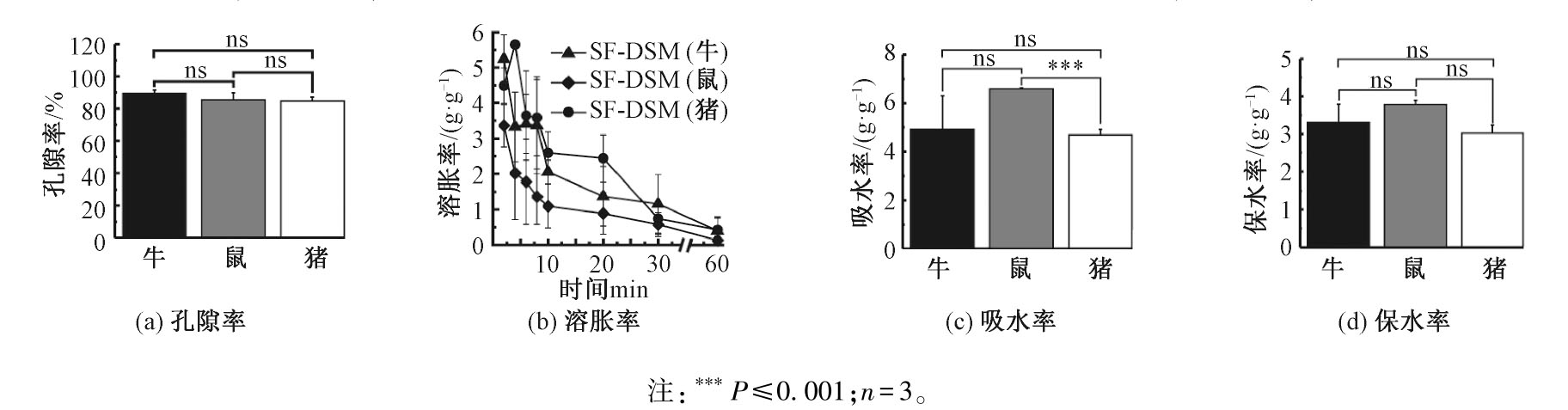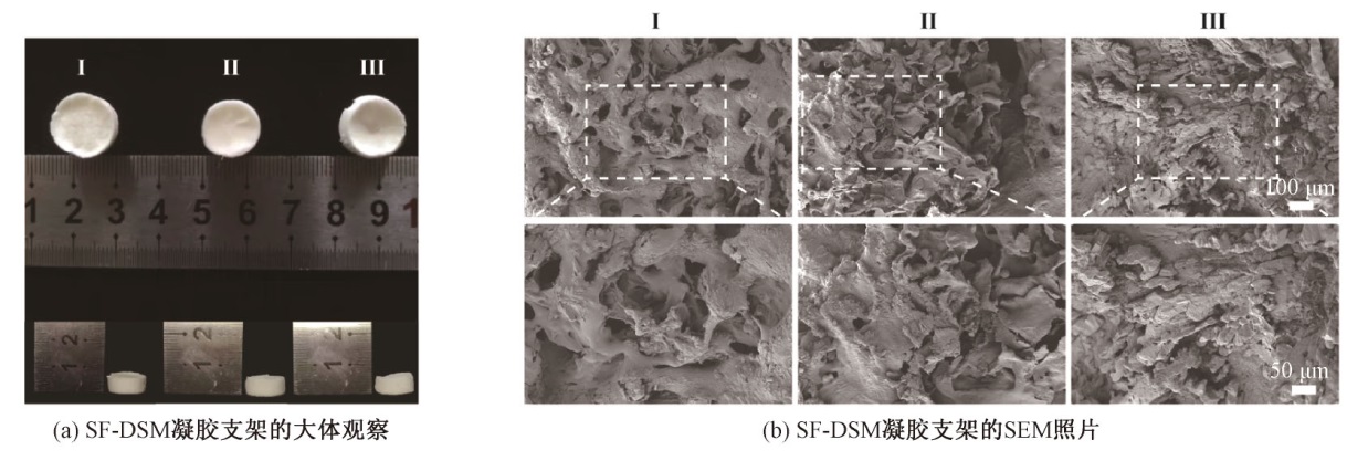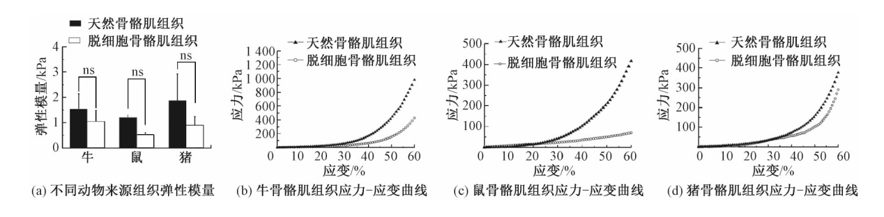 为探究不同物种来源脱细胞基质(dECM)的理化性质差异,以便在组织工程的应用中筛选适宜物种来源的dECM,将牛、鼠、猪不同动物来源的脱细胞骨骼肌(DSM)分别与丝素蛋白(SF)复合,制备SF-DSM支架。对支架的力学性能、亲水性能以及微观结构进行表征,分析不同物种来源的dECM对凝胶支架性能的影响。结果表明:不同动物来源的骨骼肌经过脱细胞处理后,其力学性能无显著性差异;牛、鼠、猪来源SF-DSM支架的弹性模量、亲水性能均无明显差异;红外光谱结果证实,SF和不同来源的DSM成功交联;不同物种来源的骨骼肌组织脱细胞前后的力学性能无明显差异,且物种间也无明显差异;SF-DSM支架的弹性模量、孔隙率、吸水性、保水性以及溶胀率均未因DSM来源不同而产生差异。