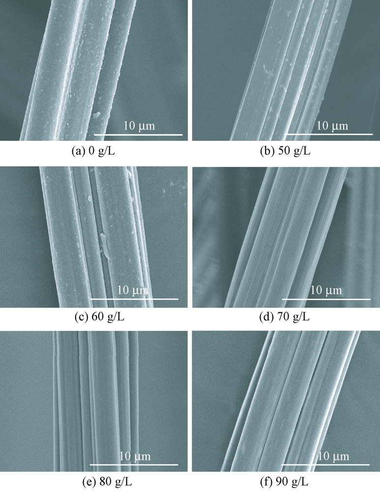 针对原液着色粘胶纤维颜色较浅的问题,采用低折射率树脂增深整理粘胶纤维,探讨了树脂种类、树脂用量、轧余率、焙烘时间和焙烘温度对纤维颜色明暗度(L值)、断裂强力和断裂伸长率的影响,借助红外光谱仪、X射线衍射仪、X射线光电子能谱仪、扫描电子显微镜等研究了树脂整理后原液着色粘胶纤维的化学结构、表面元素组成及官能团、结晶性能和表面形貌的变化。结果表明:增深剂质量浓度为80 g/L,轧余率为90%,焙烘温度为150 ℃,焙烘时间为180 s时,原液着色粘胶纤维的L值降低到11.84,断裂强力和断裂伸长率保持率分别为70.62%和70.11%;粘胶纤维的结晶度降低,但纤维表面更加光滑,含硅官能团含量增加。