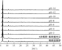 针对染料废水造成的水污染问题,采用溶剂热合成方法,将氯化锆、2,2'-联喹啉-4,4'-二甲酸(H2L)和苯甲酸混合后,在100 ℃下反应合成了三维多孔的Zr-有机骨架材料(Zr-MOF),对水中的染料进行选择性、可循环吸附。结果表明,在6组由活性染料与阳离子染料组成的双染料混合水溶液中,Zr-MOF实现了对亚甲基蓝(MB)、阳离子艳红5GN(BR14)和阳离子嫩黄7GL(BY24)的高选择性吸附,吸附效率均在79%以上,其中对MB的去除效率高达99.78%。在连续的8轮吸附-脱附循环实验后,Zr-MOF对40 mL的15.7 mg/L的MB染料的去除效率仍高达97.0%。X射线粉末衍射测试表明,经受8次吸附-脱附循环后,以及在pH值为2~14之间的强酸(盐酸)和强碱(NaOH)水溶液中放置48 h之后,Zr-MOF的结晶性几乎毫无变化,显示出十分可靠的稳定性和可循环使用能力。