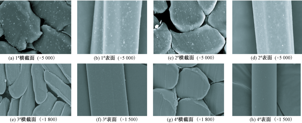 防透明聚酯与消光聚酰胺6纤维的横截面和纵向表面扫描电镜照片"