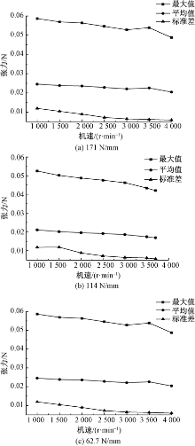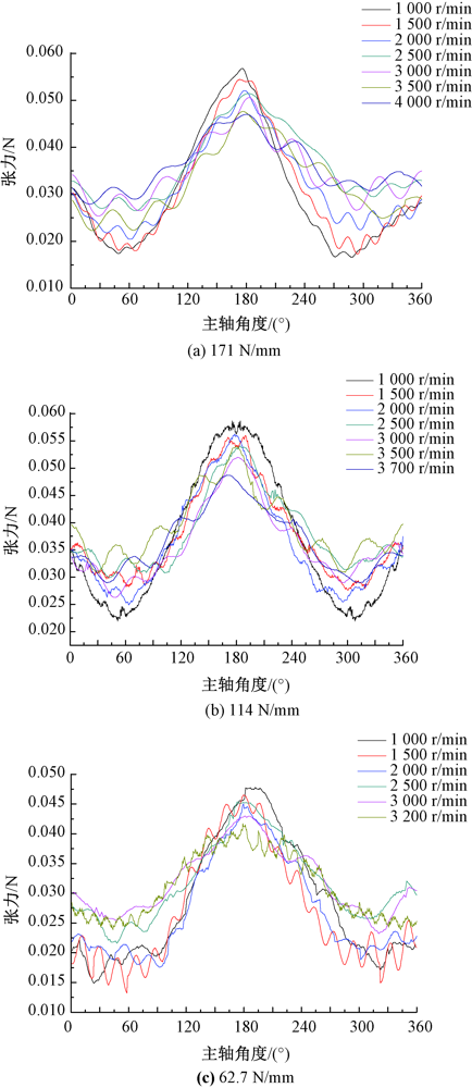 In order to achieve better control over yarn tension during high speed warp knitting production, systematic experiments were carried out on HKS2-SE high speed warp knitting machine. Measuring the yarn tension under 1 000 r/min to 4 000 r/min, yarn tension levels were evaluated with the maximum, average and standard deviation. The dynamic tension curve, probability density curve, skewness and kurtosis of the single-cycle yarn were used to analyze the tension distribution and the fluctuation of the yarn tension. With the increase of machine speed, the maximum, average and standard deviation of yarn tension is found to decrease gradually, with the tension variation among the yarns becoming smaller and the overall yarn knitting tension declining. At the same time, it is witnessed that the height of the main wave peak of single cycle tension curve decreases with smaller fluctuation of yarn tension, while the fluctuation of yarn tension tends to increase when the machine speed is set too high or too low. When the machine speed is between 2 500 r/min and 3 500 r/min, the data distribution is closer to the average value of tension distribution curve, and the yarn tension become more stable.