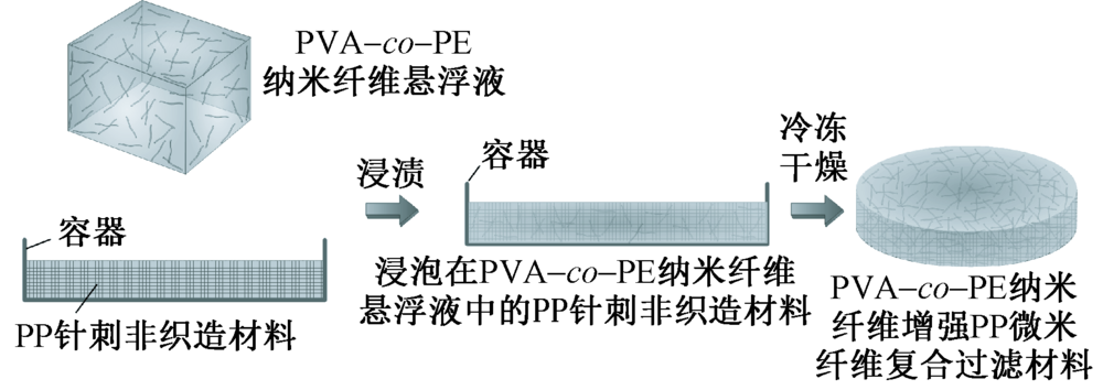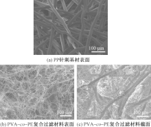 为提高常规纤维基空气过滤材料的过滤性能,采用熔融共混相分离法制备得到聚乙烯醇-乙烯共聚物(PVA-co-PE)纳米纤维并制成悬浮乳液,将聚丙烯(PP)针刺基材浸渍到悬浮乳液中进行冷冻干燥处理,得到PVA-co-PE纳米纤维增强PP微米纤维骨架复合空气过滤材料。借助傅里叶变换红外光谱仪、扫描电子显微镜、静电电位计、孔径分析仪及滤料综合测试台对过滤材料的结构及性能进行表征。结果表明:当纳米纤维的面密度为9.34 g/m2时,复合空气过滤材料对尺寸为0.3 μm的NaCl气溶胶粒子的过滤效率为99.936%,阻力压降为81 Pa,品质因数为0.091 9 Pa-1,且复合过滤材料的拉伸强度及拉伸模量相比PP针刺基材均增加50%。