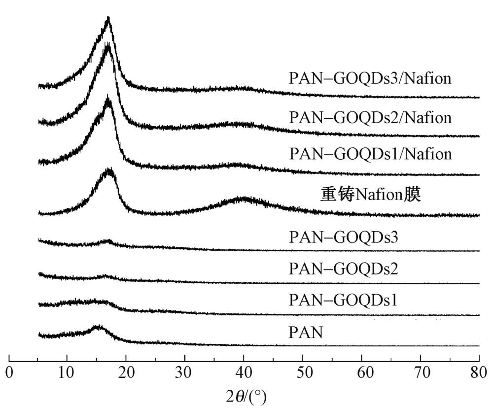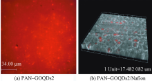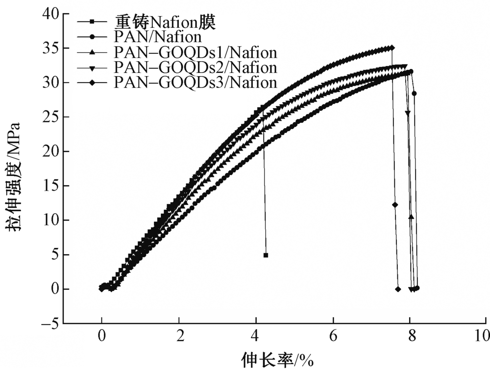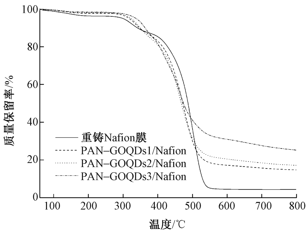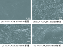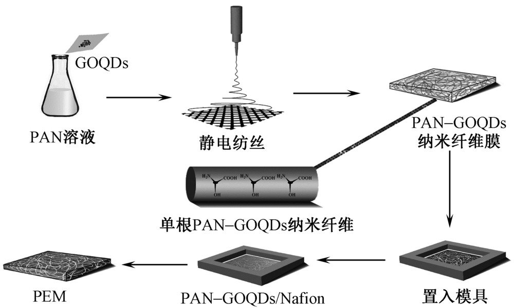 为提高全氟磺酸(Nafion)膜的质子传导率和尺寸稳定性,利用静电纺丝技术制备了氧化石墨烯量子点(GOQDs)/聚丙烯腈(PAN)纳米纤维膜,并通过Nafion溶液浸渍法制备了纳米纤维复合质子交换膜。借助扫描电子显微镜、共聚焦显微镜、热重分析仪和X射线衍射仪等对纳米纤维及复合膜的结构和性能进行表征。结果表明:GOQDs在PAN纳米纤维中均匀分布,GOQDs的加入减小了纳米纤维的直径;纳米纤维形成三维网络结构,对复合膜起到了骨架支撑作用,提高了复合膜的尺寸稳定性,同时提高了复合膜的热稳定性和吸水性;GOQDs质量分数的增加提高了复合膜的质子传导率,80 ℃时复合膜的质子传导率最高可达0.182 S/cm。