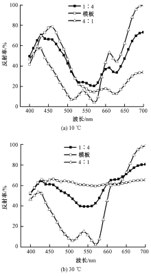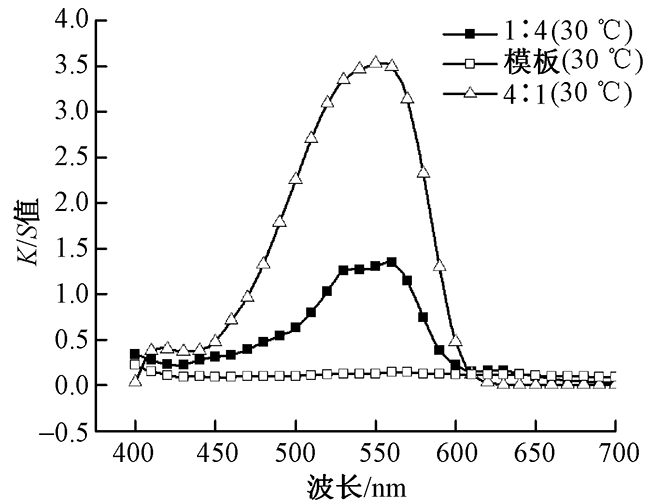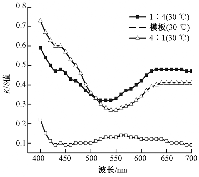 为解决热敏变色材料色谱范围窄、颜色变化单一的问题,以使用原位聚合法得到的热敏变色微胶囊为基础模板,将其分别与制备的红、黄色微胶囊进行拼色实验。通过减法混色原理,不同颜色的微胶囊混合后会呈现出另一种颜色,达到了色谱拓展的目的。借助扫描电子显微镜及红外光谱仪表征了微胶囊的形貌和结构,测试了拼色样品的色差、反射率、K/S值。结果表明:成功制备出了以甲醛-三聚氰胺树脂为壁材、三芳甲烷类基础变色体系为芯材的热敏变色微胶囊;随着外界温度的变化,微胶囊混合体系的颜色也发生显著变化,实现了在不同色调之间的可逆变化,拓展了热敏变色微胶囊的变色色谱范围。