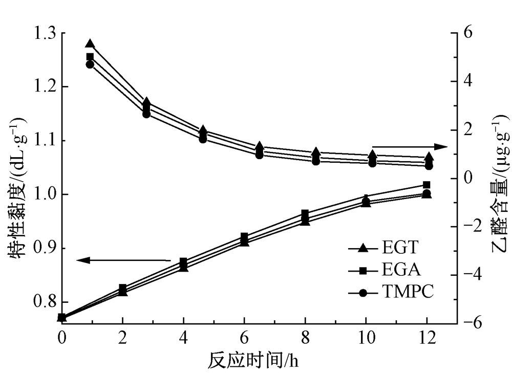 220 ℃条件下全程固相缩聚特性黏度与乙醛含量的关系"