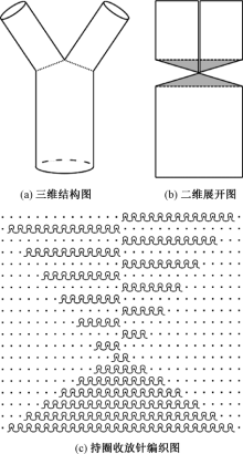 为利用双针床全成形电脑横机开发符合市场需求的产业用管状织物,以Y形三通管为例研究了全成形管状织物的成形方式与编织工艺的设计方法。利用全成形织针在满针筒形编织的同时进行前、后针床的移圈收放针,改变织物的横向宽度实现Y形三通管的全成形编织。通过将Y形三通管的三维结构转化为二维形状,根据尺寸、织物密度、编织方向与管间夹角等参数,设计与计算编织工艺。结果表明:Y形三通管织物管间夹角的大小由移圈收针时的编织收针比例决定,编织收针比例越大,管间夹角越大;采用不同的管径与织物密度实际编织2种角度的Y形三通管织物,验证计算公式的准确性与设计方法的可行性。
