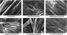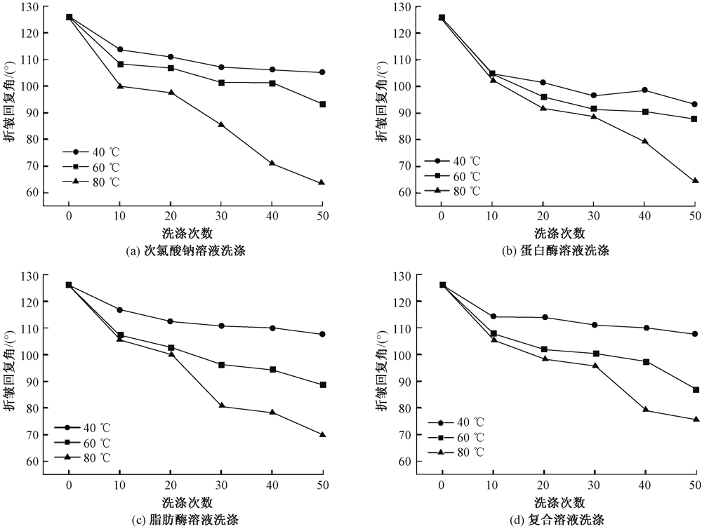 为探究多元羧酸免烫棉织物在日常洗涤过程中免烫性能的保持情况,实验模拟了日常家庭洗涤的环境,对免烫棉织物在不同的洗涤助剂类型、不同洗涤温度、不同洗涤次数下进行洗涤处理。通过测试对比原免烫织物和不同方式洗涤后免烫棉织物的折皱回复角、断裂强力和化学结构表面形貌等,对免烫棉织物的免烫性能在洗涤过程中的保持能力进行分析。结果表明:经重复洗涤,免烫棉织物的断裂强力和折皱回复角都呈现出不同程度的降低;纤维的表面形貌及微观结构都产生了一定的变化;经80 ℃混合溶液重复洗涤处理50次后的断裂强力下降约26%,折皱回复角降低约50%;对免烫棉织物而言,在家庭洗涤过程中,高温复合重复洗涤对其免烫性能的破坏作用较大。