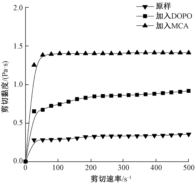 原样和加入DOPO、MCA的聚酰胺6/甲醇-氯化钙涂层浆的剪切速率与剪切黏度"