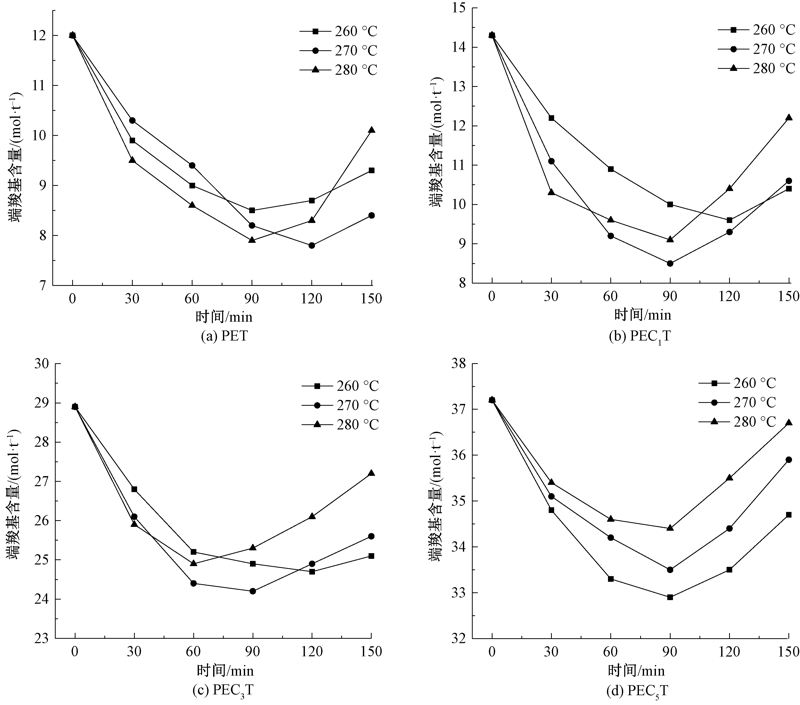 不同温度下PET和含磷阻燃共聚酯端羧基含量与熔融增黏时间的关系"