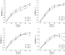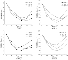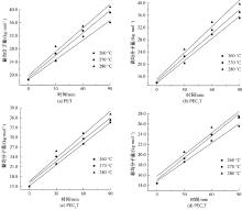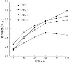 不同温度下PET和含磷阻燃共聚酯特性黏度与熔融增黏时间的关系"