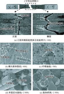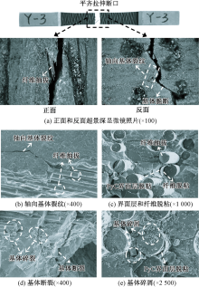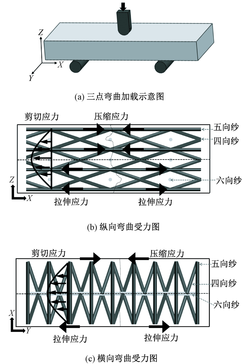 为解决陶瓷基复合材料在服役过程中因拉伸和弯曲导致的失效问题,以三维六向编织SiCf/SiC复合材料为研究对象,分析了受力过程中复合材料力学行为与纤维及结构的联系机制。采用微计算机断层扫描技术获得材料结构及孔隙的三维图像,对复合材料纵向和横向进行拉伸、弯曲性能测试,并阐明其损伤机制。结果表明:复合材料呈现明显的各向异性特性,纵向拉伸强度和弯曲强度分别是横向的10.37、5.06倍;复合材料不同方向受力的损伤模式不同,拉伸载荷下纵向试样裂纹沿着六向纱呈Z字形扩展,而横向试样裂纹沿着编织轴向扩展,最终导致拉伸破坏;弯曲载荷下裂纹沿着厚度方向扩展,并最终导致纵向及横向试样的韧性断裂,且纵向韧性优于横向。