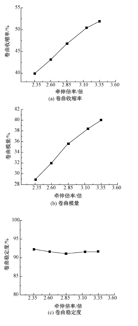 为研究聚对苯二甲酸乙二醇酯/聚对苯二甲酸丙二醇酯(PET/PTT)并列型复合纤维制备工艺与其结构及性能之间的关系,借助二维广角X射线衍射仪、差示扫描量热仪等对未牵伸以及2.353.35倍牵伸纤维的结晶取向性能、热性能、力学性能以及卷曲性能进行测试与分析。结果表明:随着牵伸倍率的增加,PET/PTT复合纤维内部单组分结晶度变化有所差异,PET组分结晶度由43.04%增至45.73%,但PTT组分的结晶度几乎不变,其取向度由82.3%增大至89.2%,然后保持稳定,说明牵伸诱导取向达到饱和;同时,取向度的增大也导致PET/PTT 复合纤维的弹性模量由16.8 cN/dtex增加到23.1 cN/dtex,断裂强度由2.9 cN/dtex增加到3.5 cN/dtex, 但断裂伸长率由52.6%下降到38.6%;牵伸倍率的增加导致双组分纤维结构差异明显,使复合纤维的卷曲性能更加优异。