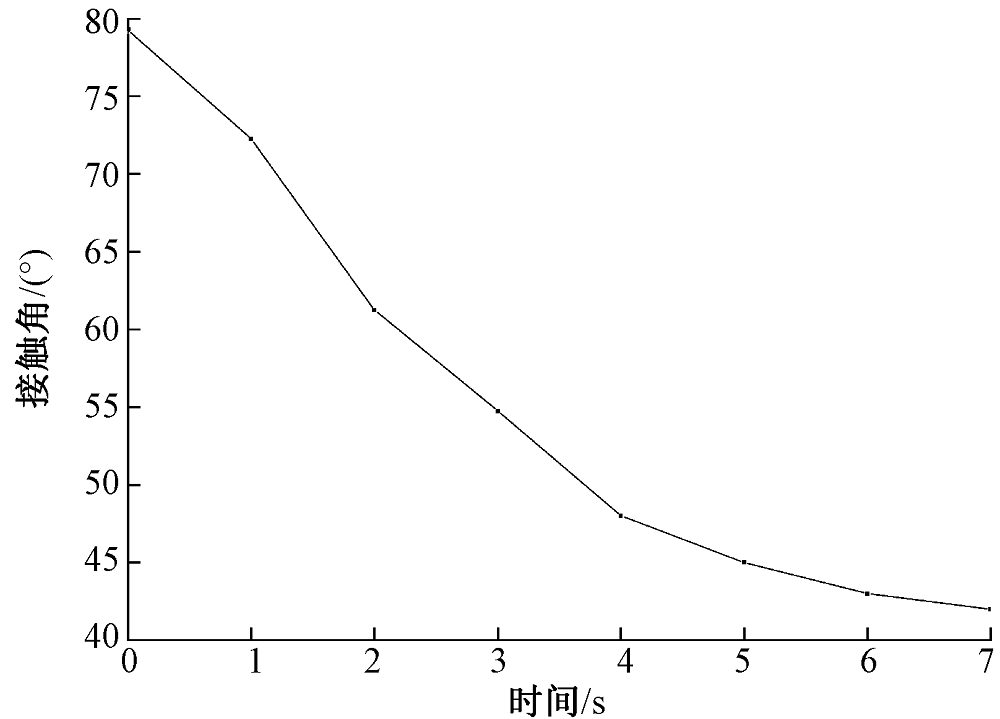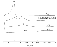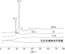 Results In the prepared nanofiber membrane without beading, the fibers with an average diameter of 346.1 nm were found thin and straight when the mass ratio of chitosan (CS) to collagen (Col) is 1:1 (Fig.1). When the voltage was set to 12 kV, the propulsion speed was 1.5 mL/L, and the receiving distance was 20 cm, the fibers without adhesion phenomenon showed straight and smooth, in which the average fiber diameter was about 264 nm, and the diameter CV value was 14.51% (Tab.2 and Fig.3). Based on the optimal parameters of electrospinning, the colorimetric sensing nanofiber membrane was prepared with hematoxylin (Fig.4). The thickness of the nanofiber membrane was 0.01 mm, in which the average diameter of the fiber was 246.2 nm. The colorimetric sensing nanofiber membrane had a peak of 93.8 ℃, which is lower than CS and Col (Fig.5). This believed to be precise because the melting temperature of polyethylene oxide (PEO) in the nanofiber membrane is lower than that of CS and Col. Therefore, the introduction of PEO reduced the melting temperature of the nanofiber membrane, indicating that the three materials successfully integrated into the nanofiber membrane. Furthermore, the stucture test results showed that the nanofiber membrane reveals a peak near 10°, meanwhile, the peak strength is lower than that of chitosan and collagen (Fig.6). It may be because CS and Col were successfully mixed, which destroys the helical structure of collagen and affects the crystal structure of nanofiber membrane. The contact angle test results showed that the contact angle of the prepared nanofiber membrane changed from 80° to 46° within 4 s, which showed good hydrophilicity and suitability for medical applications (Fig.7). Most importantly, the color changes of colorimetric sensing nanofiber membranes at different pH values (Fig.8). With the increase of pH value, colorimetric sensing nanofiber membranes exhibited different colors. When pH value increased from 5 to 7, the color change was more obvious, the fiber membrane changed from yellow to purple, the color difference from 0 to 10.59, and the color change of nanofiber membrane could be observed by naked eye, which was in line with the need of wound monitoring.