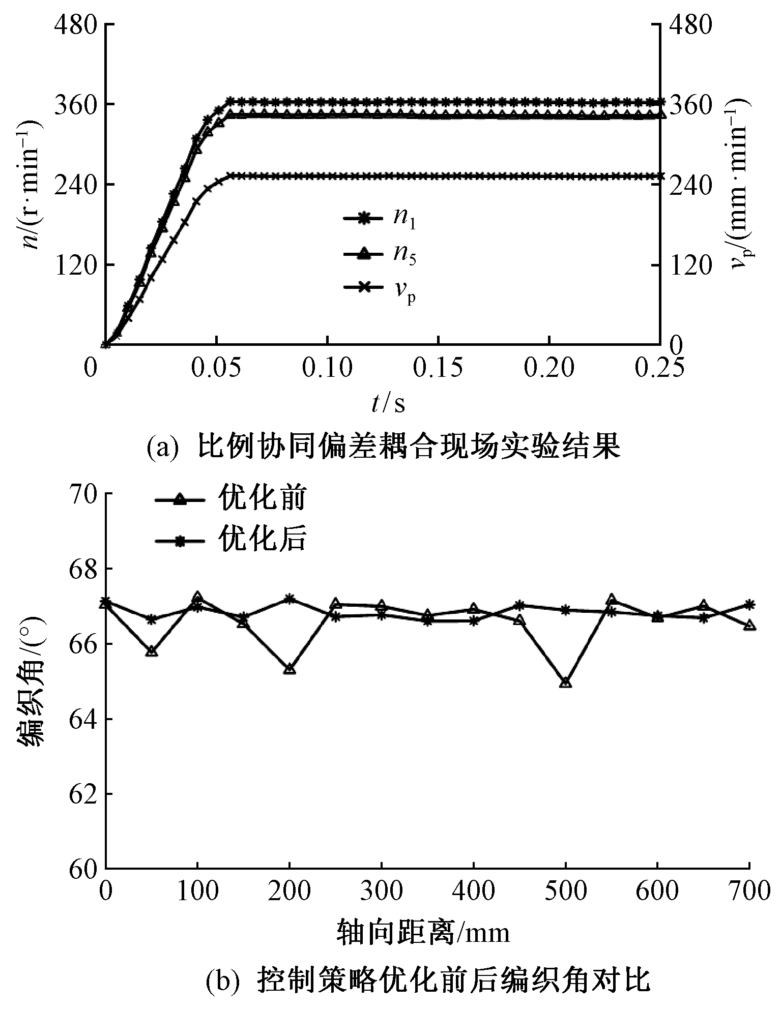Results It was showed that the braiding machine motor speed can reach the stable state within 0.05 s under both two control strategies. The fluctuation of the motor speed under the dynamic uniform load control condition is within 2%, while the fluctuation of the motor speed under the parallel control condition is within 1%. Braiding machine motor torque showed that the output torque reaches the stable state within 0.05 s. For the same time, the maximum deviation of the output torque under the parallel control model is nearly 1 N·m, while the maximum deviation of the output torque of the dynamic uniform load control is about 0.2 N·m. Simulation results before model coupling shows the duration to the stable state for the braiding machine, winding machine and traction device. Since the three devices are independent of each other and have no direct physical connection, the times to steady state of these three devices are different. The motor speed of the braiding machine and the winding machine can be stabilized within 0.03 s, while the motor of the traction unit can be stabilized at about 0.08 s. Simulation results after model coupling shows the time to the stable state for the three devices under the proportional synergistic deviation coupling control model. The motor of the three devices reached the stable state within 0.08 s. The measured motor speed of the three devices under the proportional synergistic deviation coupling control condition showed good agreement with the simulation results. Braid angle comparison before and after control strategy optimization showed the braid angle fluctuates greatly before the optimization, while the weaving angle fluctuates little after the optimization.