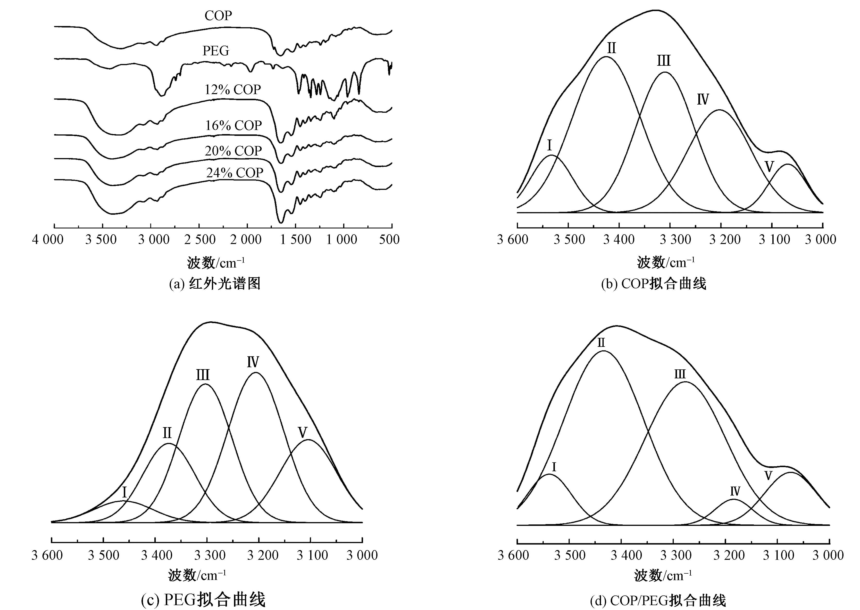 Method COP was blended with PEG to form the spinning solution with 60% formic acid as solvent. The surface tension and conductivity properties of the solution were measured by a tensiometer and conductivity meter. Scanning electron microscope was utilized to observe the surface morphology of the electrospun nanofibers. The interaction between COP and PEG was analyzed by Fourier transform infrared spectroscope, and the positions and strength distributions of different types of hydrogen bonds were fitted by the Gaussian method in the range of 3 000-3 600 cm-1. The fibrous membranes' thermal characteristics and crystalline structure were also examined using differential scanning calorimeter and X-ray diffractometer(XRD), respectively.