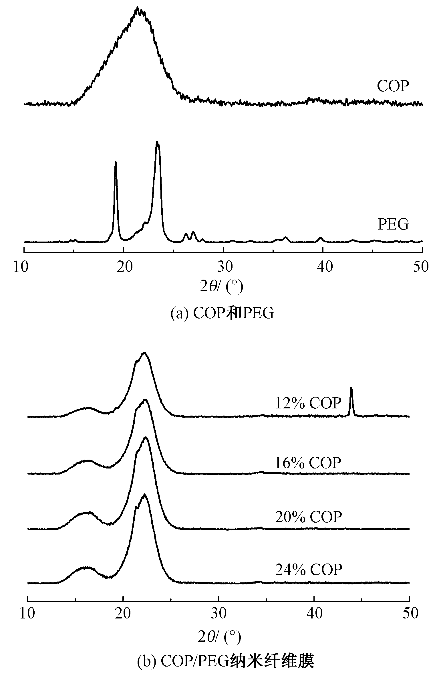 COP、PEG及COP/PEG纳米纤维膜的X射线衍射图"