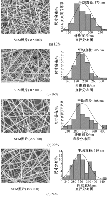 不同COP质量分数COP/PEG纳米纤维膜扫描电镜照片及直径分布图"