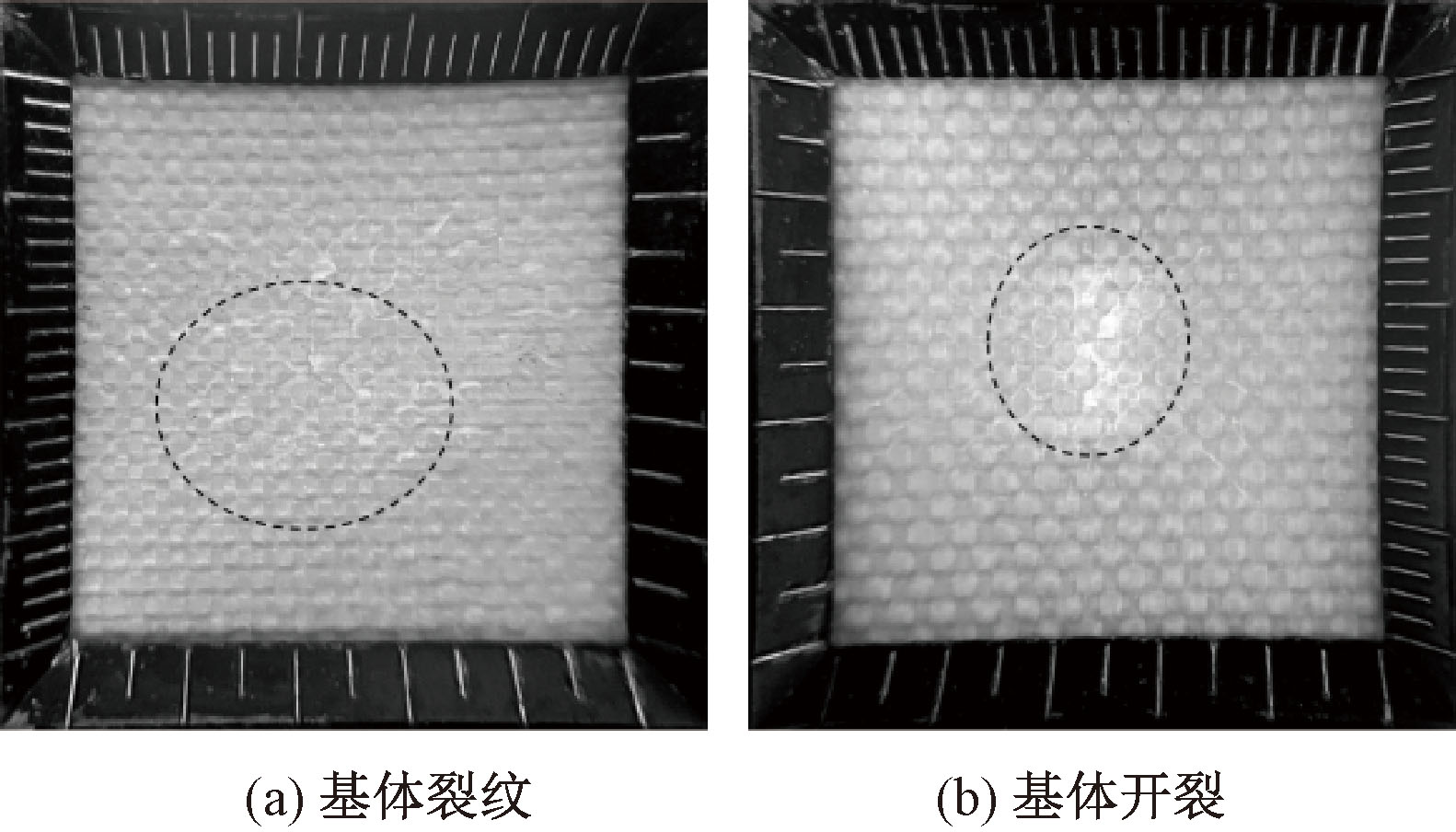 材料背面基体裂纹和基体开裂形貌图"