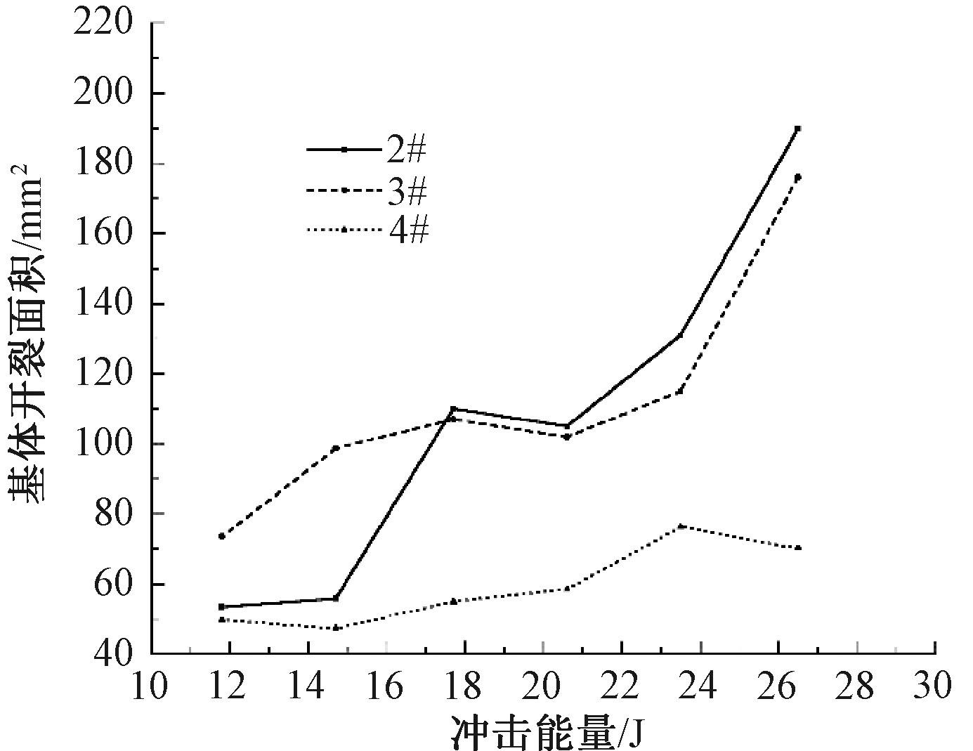 不同冲击能量下不同纬密材料的基体开裂面积"