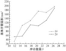 不同冲击能量下不同紧度材料的基体开裂面积"