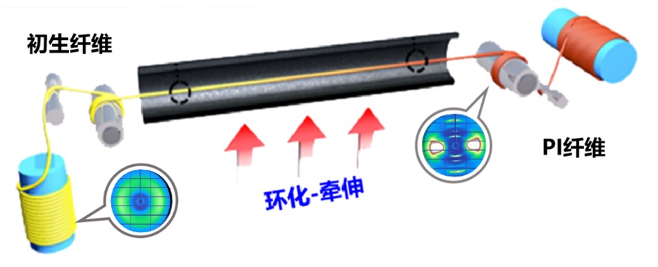 聚酰亚胺(PI)纤维是新型芳香族高性能纤维的典型代表,具有优异的耐高低温性能、耐化学腐蚀性、耐热稳定性及耐辐照性能,在航空航天、特种防护、国防军工、信息通讯等领域具有广泛应用。研究表明,PI纤维的结构和性能主要依赖于热亚胺化过程,该过程通常会伴随溶剂挥发、环化脱水、分子链重排等多重物理和化学变化过程,对纤维聚集态结构和物理性能有重要影响。通常而言,热亚胺化过程存在快速阶段和慢速阶段。在一定温度下,反应先快速进行,达到一定程度后反应缓慢,即“动力学中断”,影响纤维的力学性能。